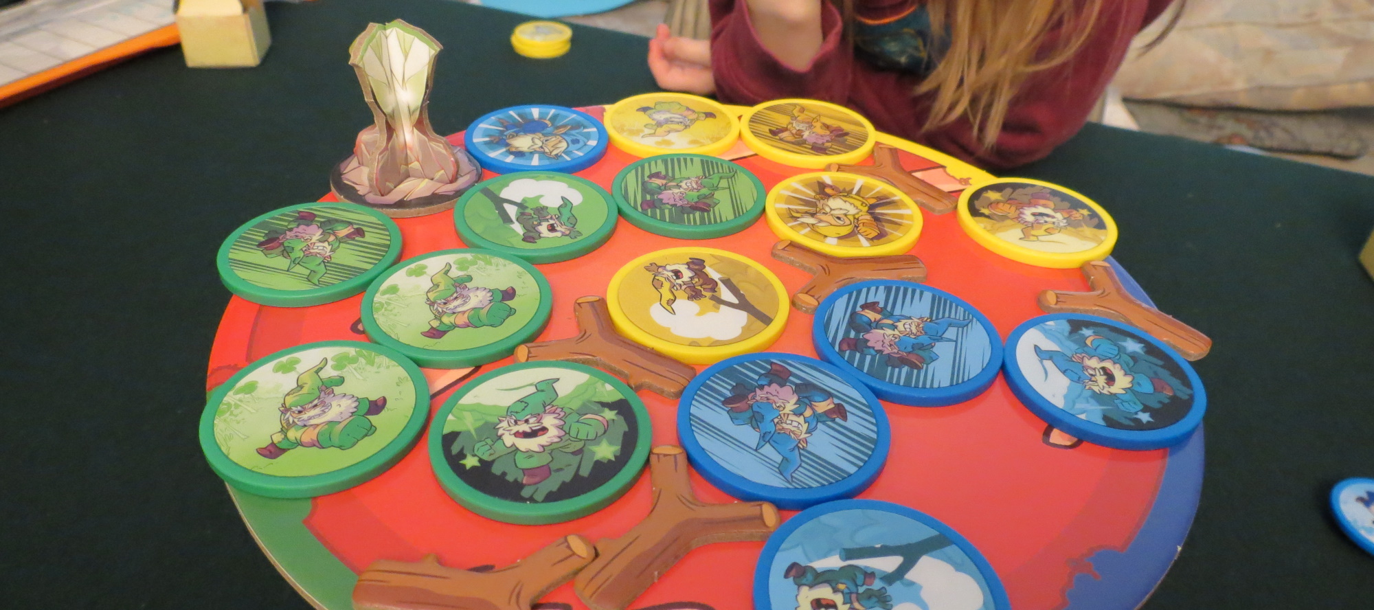 The GREAT CRYSTAL did not fall. The ordeal lasted until everybody had played their entire hand of gnomes. This time, the victor was not clear. We went through the tabulations — one point for a fighter or vaulter gnome, zero for a twin but six if both twins of the same team were in your captured pool, five for a champion, minus five for your own champion, minus one for a grump of any color. We’d played point salad Eurogames with simpler arithmetic, and certainly with better visibility. “Which one is a grump?” somebody asked. Another wondered aloud why this game, supposedly for kids, made us refer to the score chart in the rulebook instead of printing the point values directly on the discs. Is it because somebody was operating under the assumption that every kid loves referring back to the rulebook?