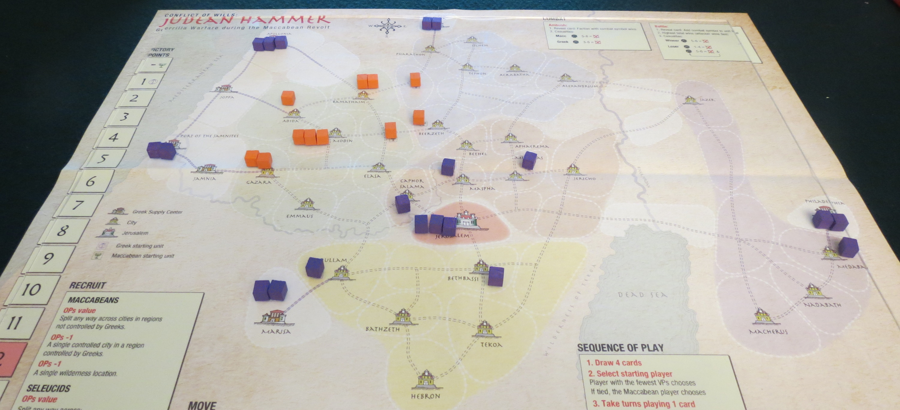 In the first case, it’s easy to come away with the impression that the whole thing is too light, too airy, too prone to rewarding a few established moves over surprising or clever plays. It’s easy to see how Judean Hammer could have been… not better, but heavier. More complicated supply lines, better for picking apart the Seleucids one segment at a time. Something like the COIN System for modeling irregular guerrilla actions. Crud, even modern area control, with units occupying overlapping spaces, would have permitted more granularity.