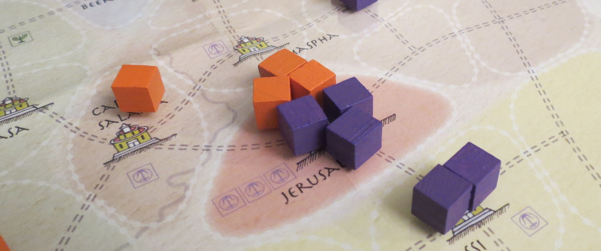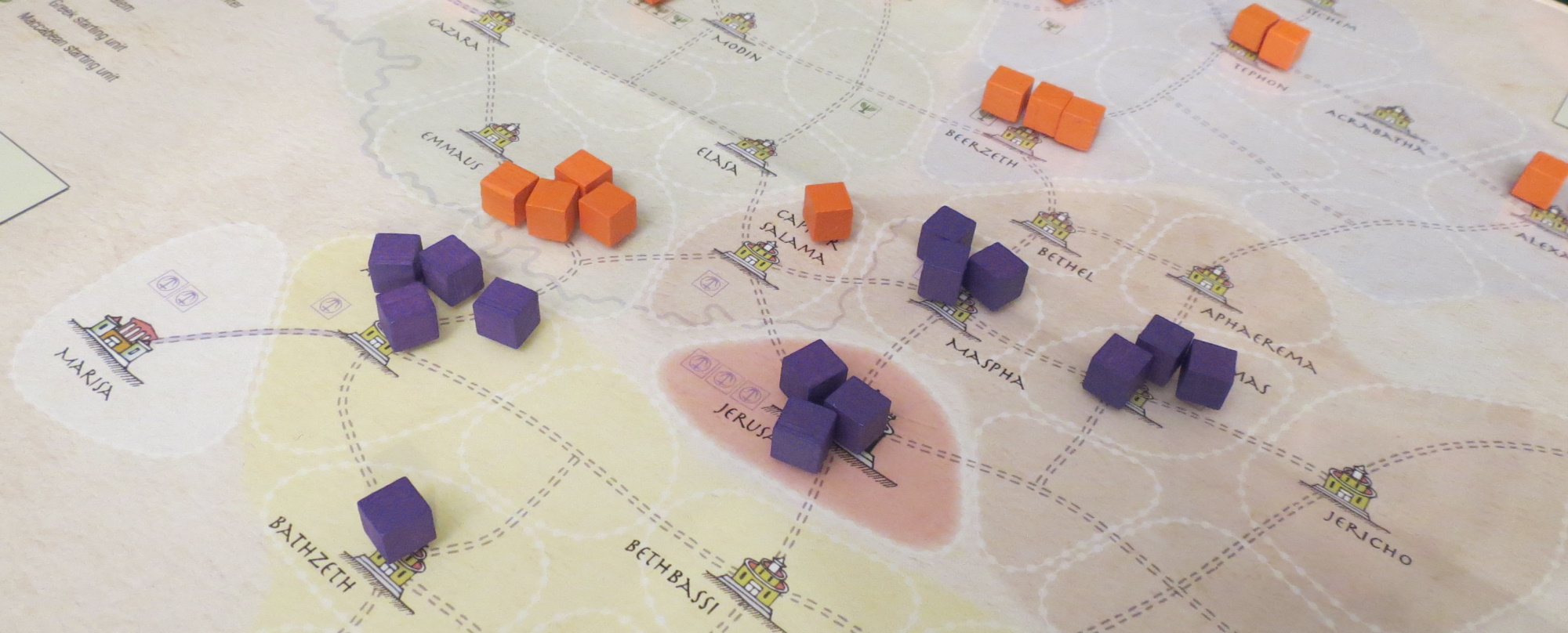 As far as wargames go, Judean Hammer’s rules are comfortably familiar. The forces of both the Maccabees and the Seleucids are represented by cubes. These will march and fight to claim ground and inflict casualties. Every so often the status of the war will be tallied as victory points, with each of six regions awarding a point for whichever side holds the majority of its cities. This being Judea, Jerusalem is the bull’s eye of the entire conflict. It’s a region of one — and therefore a victory point that requires only the seizure of a single space — as well as a crossroads of supply routes and the jewel that will almost certainly need to be captured for either side to manage victory.