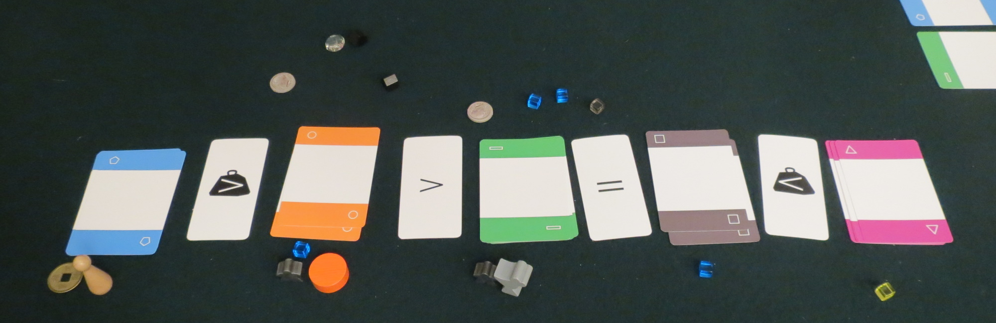 My wife doesn’t suffer from similar indecision. She quickly pronounced Lots a “classroom game.” Something you’d play as an illustration of principle. Easy to see why. Much of the game is about parsing value in a way that feels reminiscent of a first-grader’s math homework. Initially, the values are crystal clear. You have five stacks of colored cards, each representing a different “lot.” The validity of a lot is assessed by how it conforms to the symbol on its right. If red holds more pieces than orange, it will score equal to how many pieces it holds! If green is heavier than gray, it will also score! The rightmost lot will never score! That sort of thing.