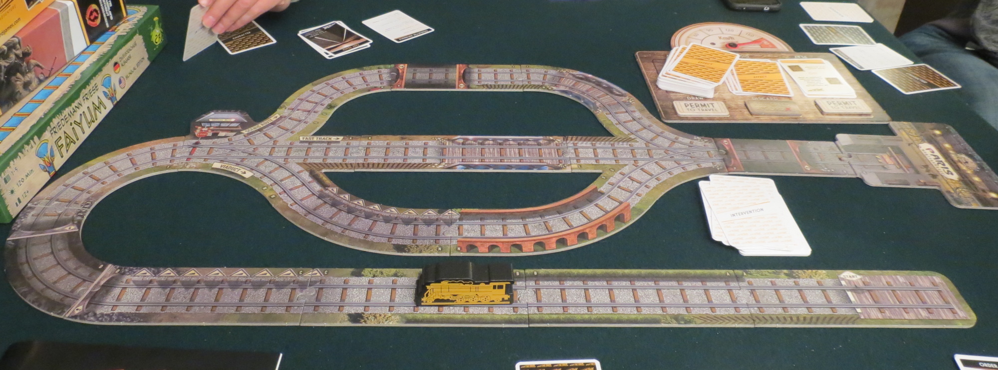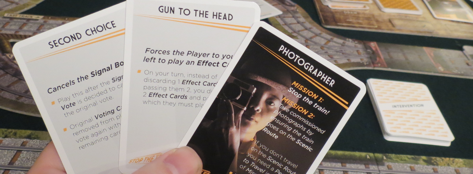 In other words, far too many turns go through the motions. Literal motions. Drawing, discarding, passing, discarding, revealing. Anything other than leaking kernels of information to your fellow players. Stop the Train! even seems to recognize this. Because player agency is so scant, there’s almost no social deduction to be had. Instead, the game offers two mitigating factors: permits to travel, which players will regularly steal from one another, and single-use “intervention” cards. The first, as I’ve noted, let their owner bypass their secondary victory condition. This does offer player agency; you’re choosing to win! But it’s rarely interesting, since once again the player likely did nothing to earn a permit or to deserve its loss. Intervention cards manage to upend the formula enough that they’re appreciated when they work, but it isn’t uncommon to never need one, or worse, to draw cards that might benefit a different hidden role than your own.