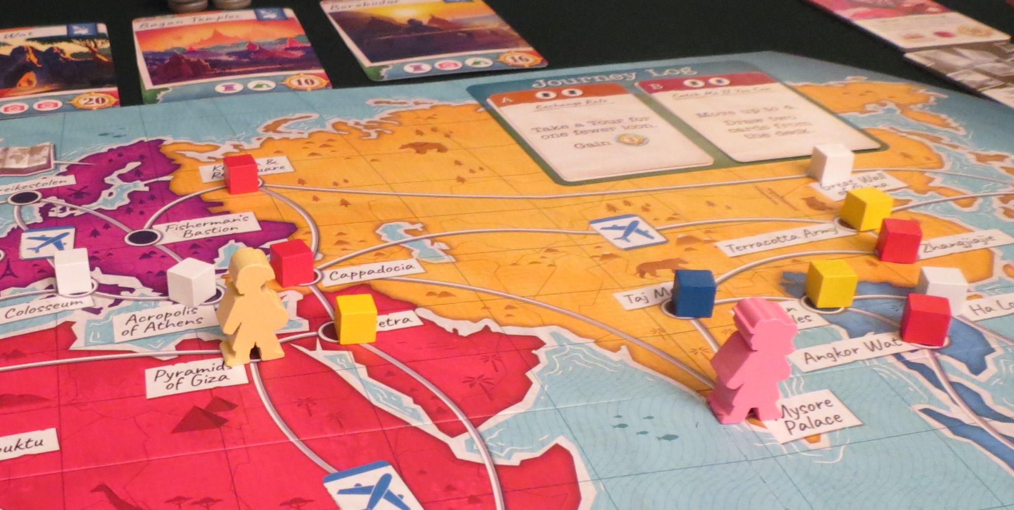This is a set collection game. Multiple times over, in fact. Your trekkers, nameless and faceless pawns, are racing to visit destinations around the world. These destinations are drawn at random from a deck. Why? “What a strange question,” Trekking the World seems to ask. “Why would a game ask why, let alone answer? Isn’t a game more a function of if, when, how many, how much? Anything but why. There is no room for intent. Purposelessness is the purpose. Just relax and play.”