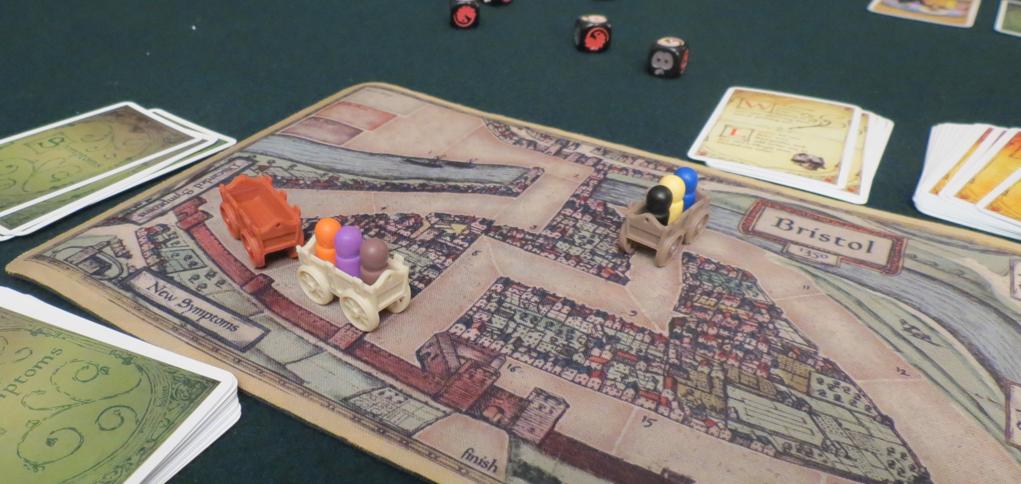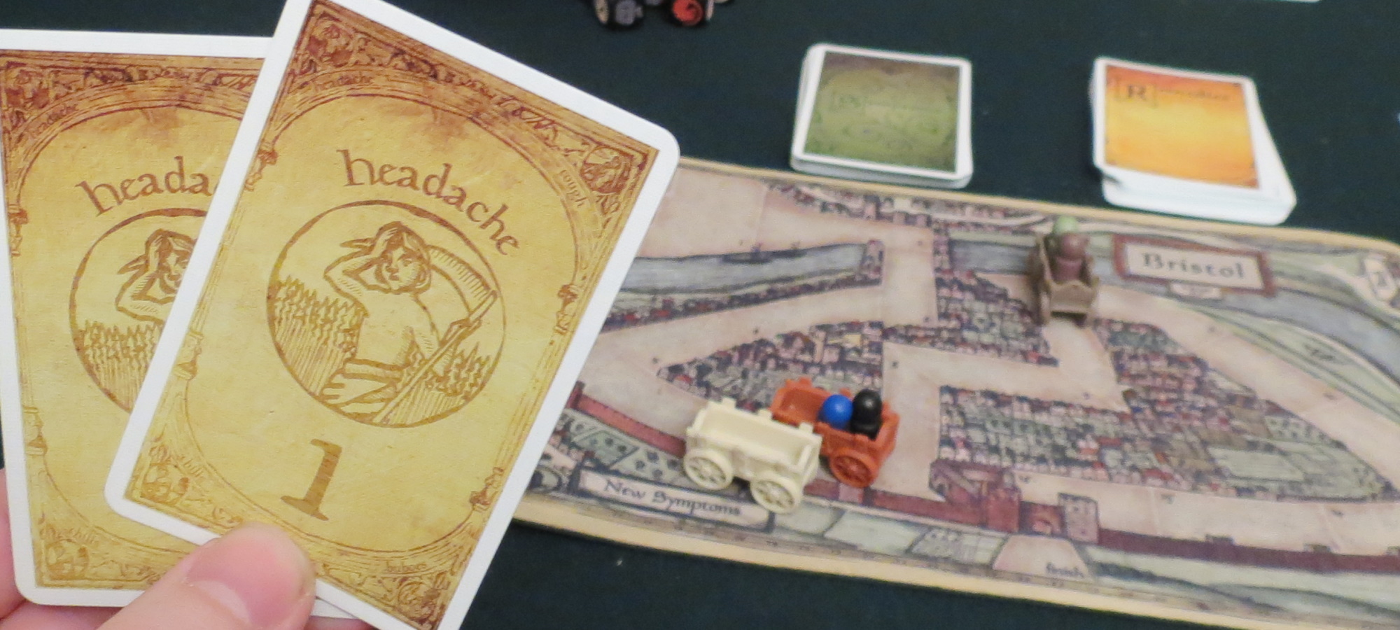 Gross. Also one of the most important events that can occur in Bristol 1350. These cards progress from low value symptoms like a cough or a headache all the way to the dreaded buboes themselves. If ever your pair of symptoms adds up to six or more, that means you have the plague, no matter what happens from that moment onward.