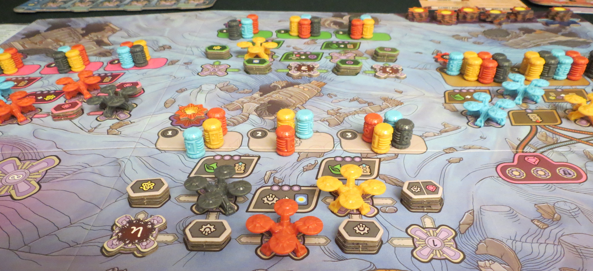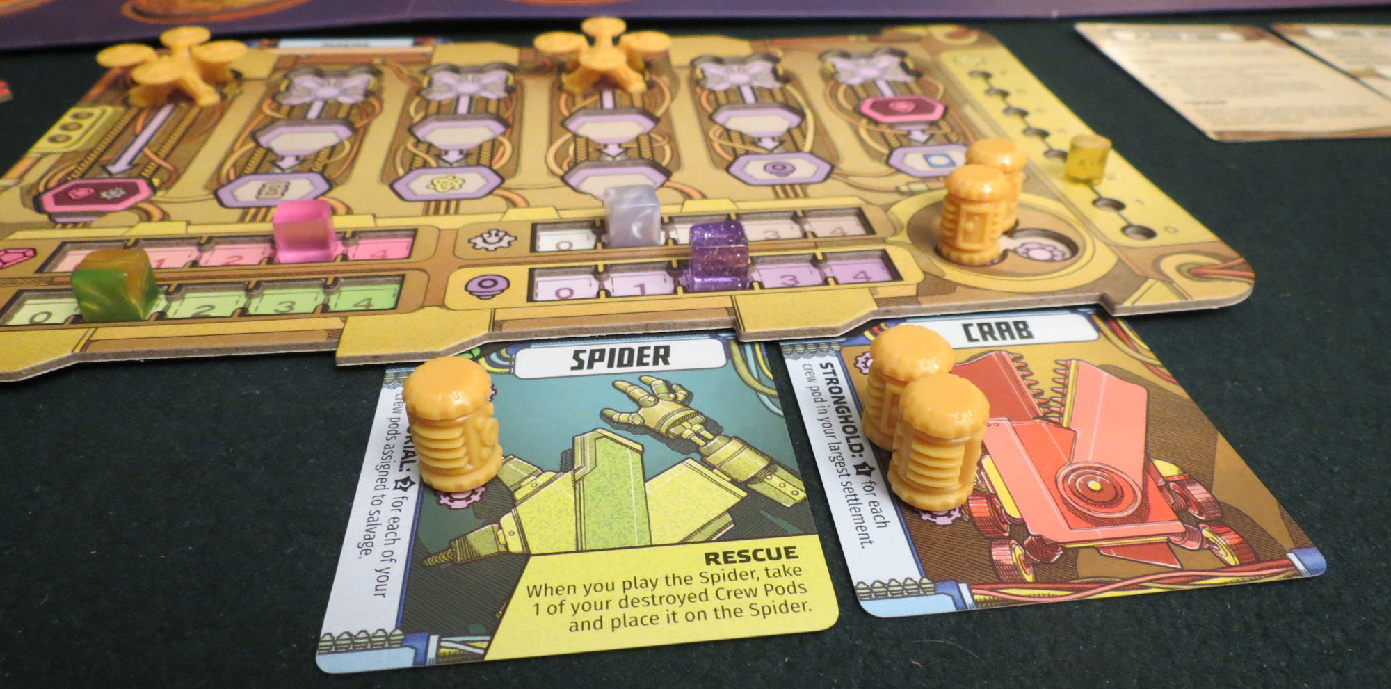 I wouldn’t call Cryo a reaction against the current trends of Eurogame design. It’s more of a reconciliation. Why have four decks when one will do? Why require multiple resource conversions when one will suffice? Why turn scoring into an arithmetic quiz? Even with hidden missions, it’s fairly easy to suss out a leader by glancing over who’s settled which caverns. Each play will have a different setup, but only slightly. A few damaged docks, different distributions of resource tokens, and slightly divergent arrangements of caverns. That’s hardly what we’d call a variable setup.
