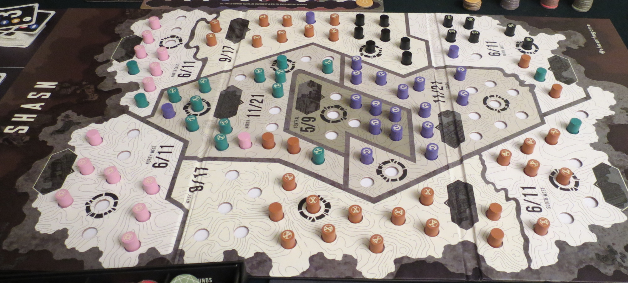 Except Shasn is more than a straightforward area control game. It’s also a deeply cynical party game. Sort of.