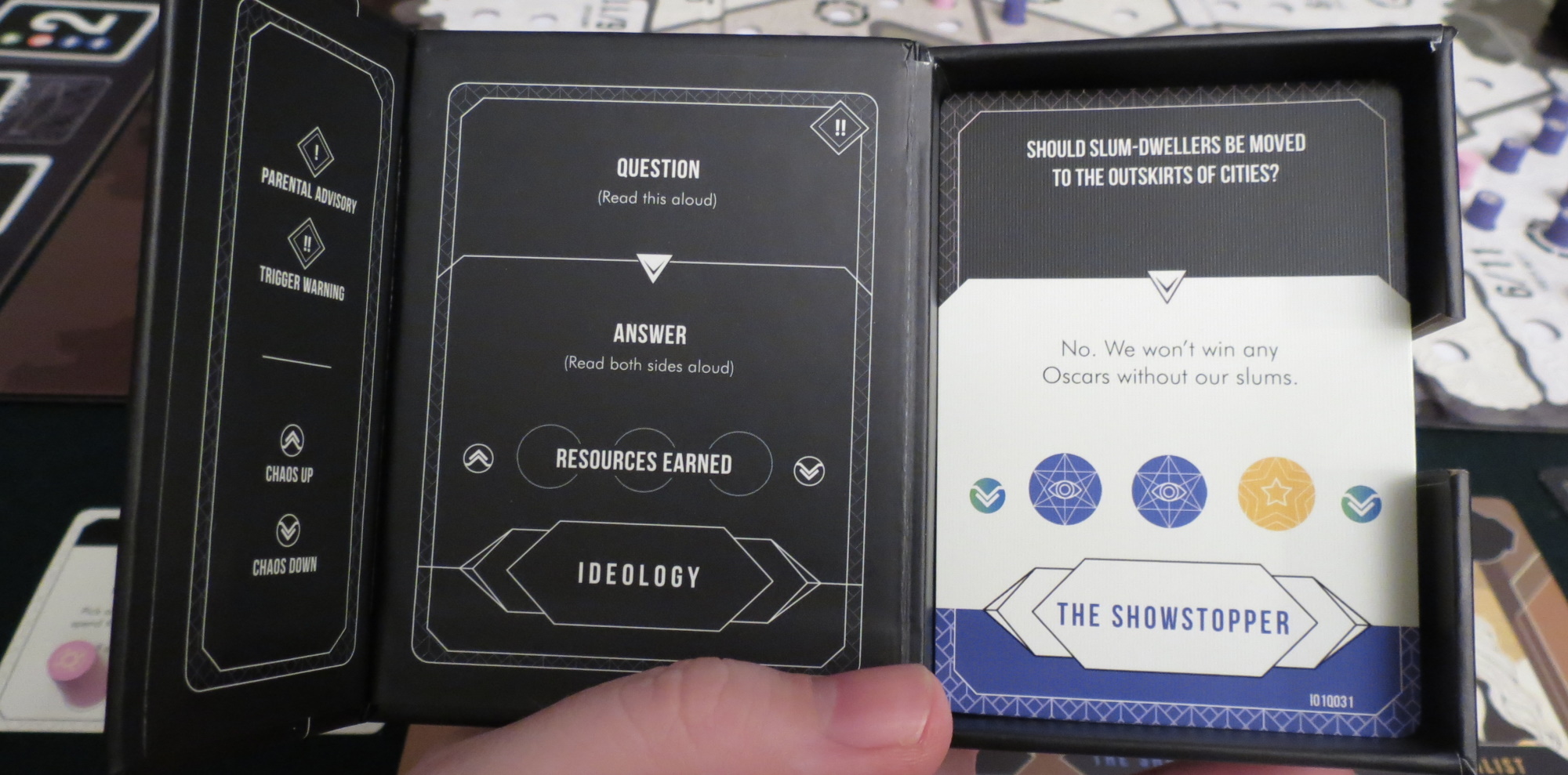 Here’s what I mean. As I noted, Shasn is a game of two halves. The first half is an area control game. The second half is a party game. Both halves spark their own emotional responses. The first is dishwater, too straightforward for its own good, at least until that final act when everything turns haywire. Boring, in other words. The second is goofball, like a highlight reel of the dumbest political flubs of the year. Regardless of which deck you’re drawing from (I’ve played through five), there’s a certain airiness to the questions and their responses. Even issues that are serious enough to warrant a content warning will sometimes slap you upside the head with a zinger. Not every response stretches for yuks, and thank goodness for that. But every so often the brazenness of a response, the bald disregard for the public good, the wackadoodle dollar signs rolling from somebody’s tongue, will earn a genuine laugh.