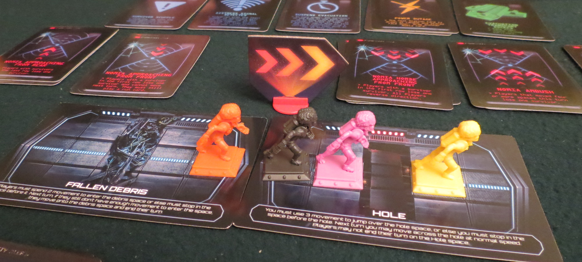 Speaking of lean, for a game that’s supposedly fast and silly — and one that includes player elimination — Evacuate sure is clogged with slowdowns and a disposition as quick as a barrel of molasses that just wintered in the Rockies. One of the cards you can add to the Nomia deck outright adds new survivors to the group in last place, which murders any sense of urgency, along with the Azota’s chance of victory. Other cards kill off those in the front of the pack. Now everybody is nudging along at much the same speed, trying to be the guy in the middle. The Medical Station lets you recover a card from your discard pile. But not the action cards. Only the raw movement ones. So much for having a good time.