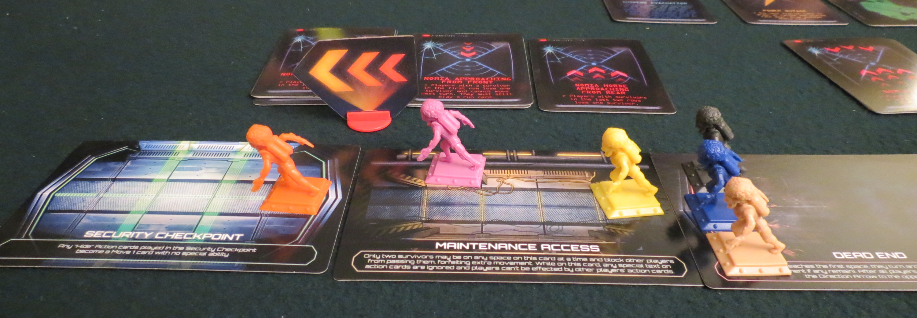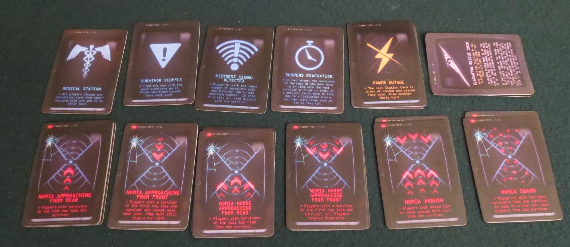 In theory, the Nomia deck is built by everybody. In theory, its contents are precious information. In theory, if somebody adds an ambush, which kills a survivor from any group that moved four or more spaces, it would make sense to slow down. In practice, everything mushes together. The deck is thick enough that there isn’t any reason to prioritize anything beyond the most basic self-preserving behaviors. It’s sluggish. Sort of like the survivors themselves, especially once they hit a corridor that slows everybody down or makes it impossible to pass by a single stinker.