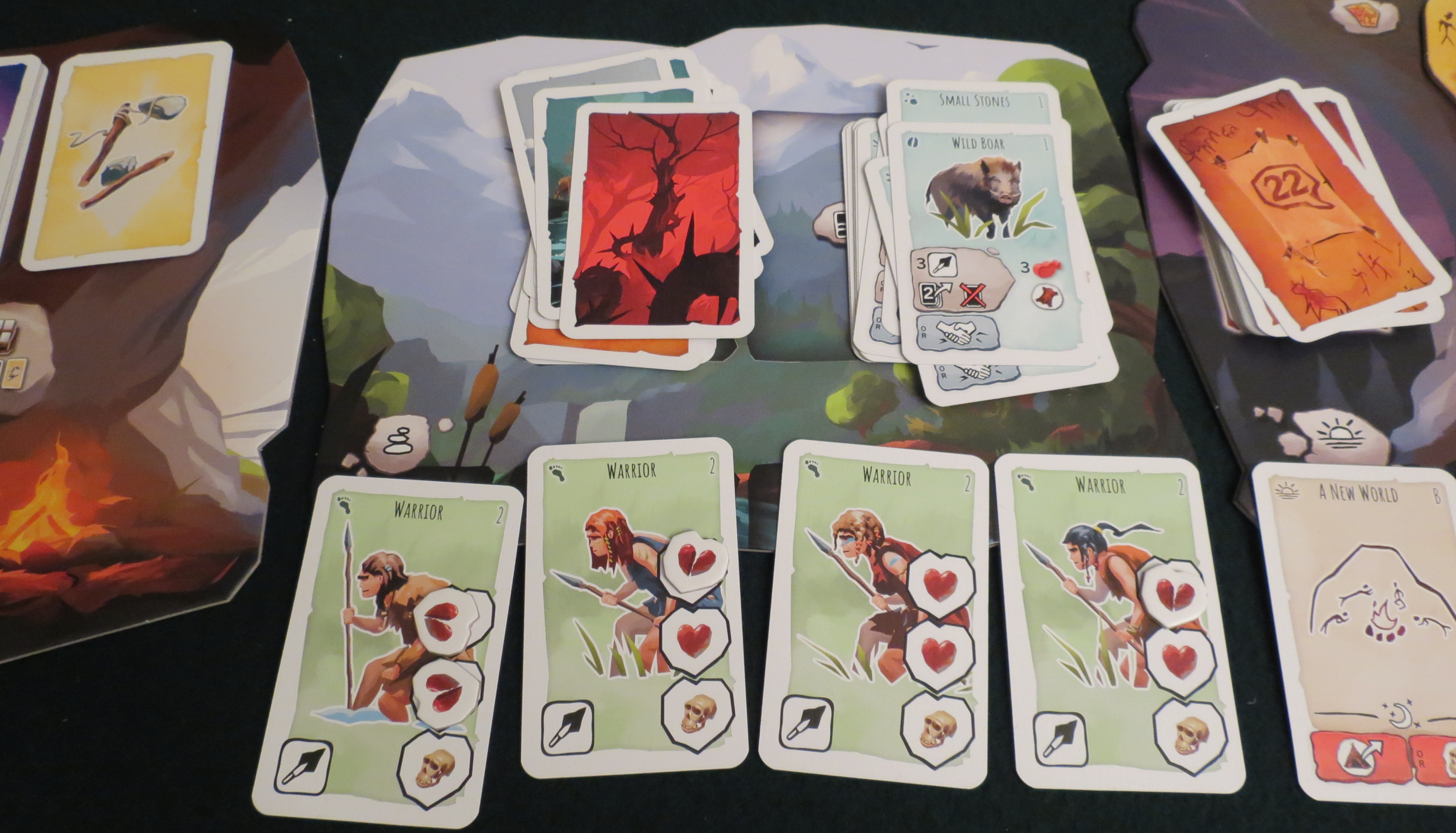 The average day for a band of humans in the Paleolithic goes something like this. Your surroundings are represented by a deck of cards. As the day begins, these are divided equally between players, much the way groups of hunter-gatherers might orient themselves in opposite directions at sunrise to maximize how much ground they’ll cover before returning to camp to share their spoils and tend to their injuries. Crucially, the back of each card shows a hint about what might be discovered there. Mountains are good sources of knappable stone, while rivers are frequented by animals and forests are filled with something called trees which can be used to make tools or keep the fire going. Resources aren’t the only things out there. Some cards show a bramble instead. This indicates danger: the howls of a wolf, dense foliage that’s easy to get lost in, a pit that hisses.