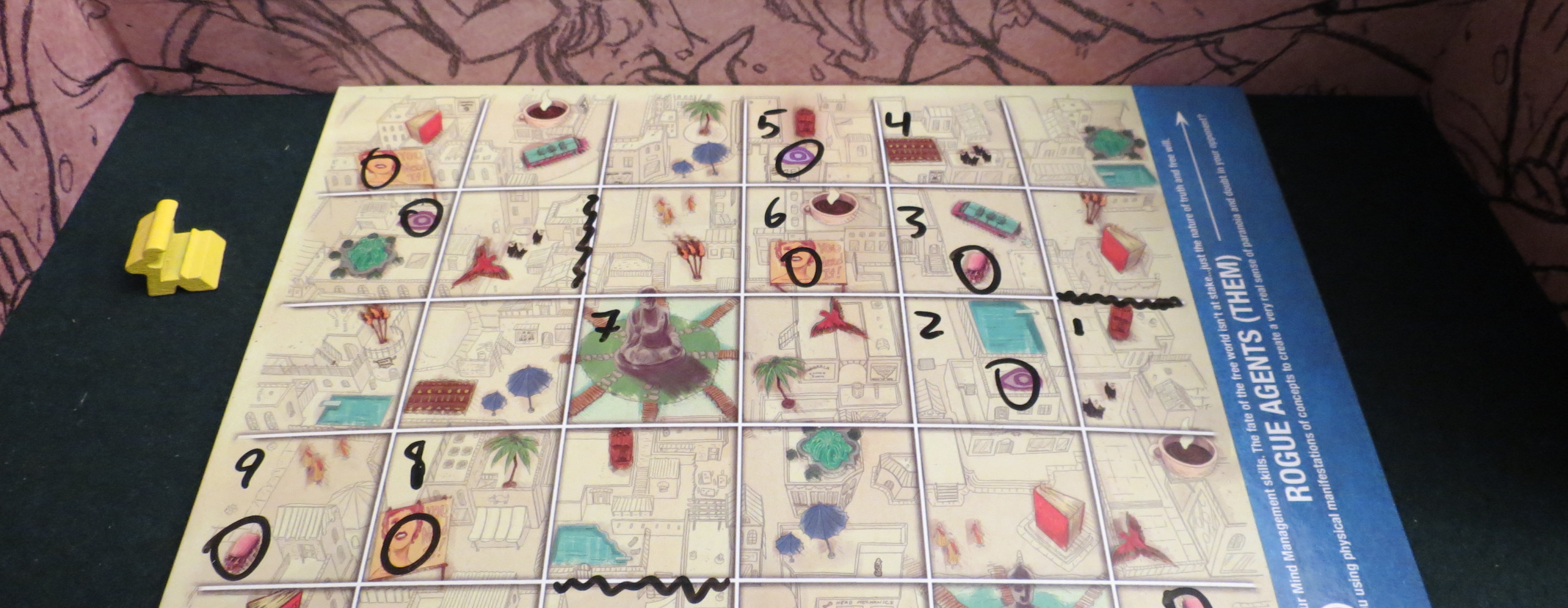 Yet there are other wrinkles. In addition to moving across the map, the recruiter also has four helpers called “immortals” who can also meet recruits. This leaks information to the rogue agents, often by indicating which cards the recruiter isn’t holding. That’s an obvious one. What makes Mind MGMT so devious is that nearly every action, question, or placed token leaks some kind of information. Even negative answers indicate that the recruiter hasn’t been here or there or there as of 13:00. This is especially useful because every single action matters. At the outset, the recruiter makes six full moves before the rogue agents give chase. This might sound unfair, but it effectively fast-forwards past the boring opening moves that are a staple of hidden movement games. It also means that the recruiter may have already made inroads toward winning the game before the game even begins. It’s an inversion, placing the rogue agents on the back foot and forcing them to scramble rather than establishing a proper grid search.