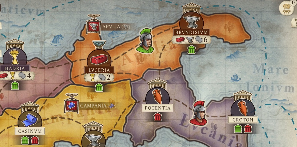 So you’ve decided to trade goods in the Mediterranean. Well done on selecting this rarest of occupations, as scarce as retail sales or clerking. The cities of the Mediterranean are all specialized; some produce grain or bricks, others iron, and the truly well-to-do towns weave cloth or press wine. It’s your job to get these resources where they need to go. Abstractly, anyway. In most cases, cities apparently need more of what they’ve already got. Apart from bricks and food — most folks hanker after those — a town that produces wine needs more wine, cloth cities need more cloth, and so on.