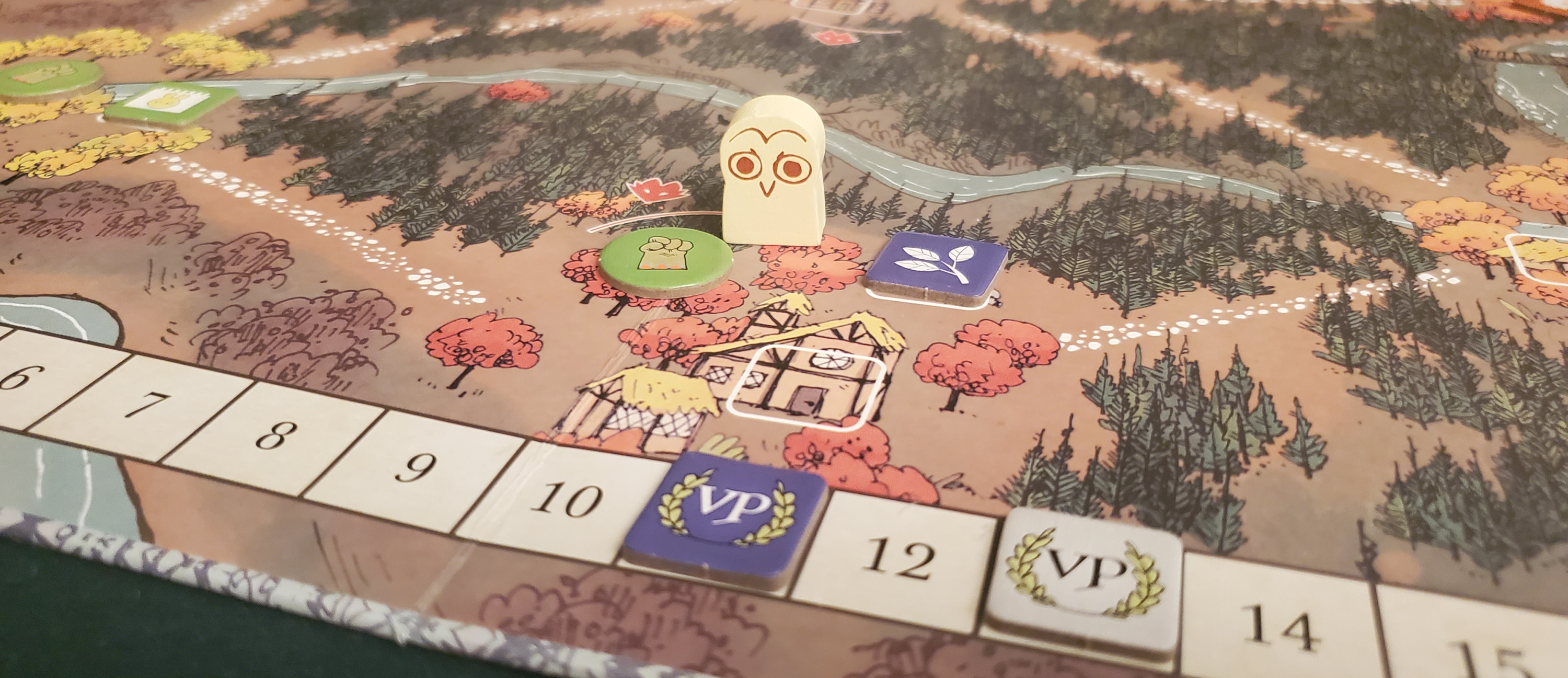We’ll talk specifics next time. For now, it’s more important to note that there are two shared features that anybody can access: craftsmanship and destruction. In the first case, items can be found on the same cards that portray the woodland’s population. To craft these items, one requires the proper capacity; usually workshops of some kind, although every faction has its own means of production. These acts of craftsmanship award points immediately. The second shared method of gaining points is the direct inverse: as structures and goods begin to fill up the woodland’s clearings, you can destroy them. Like crafting, these points are awarded the instant the building is torched.