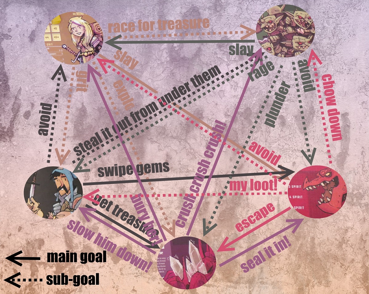 Back when I wrote about Vast: The Crystal Caverns, David Somerville’s design that became Leder’s breakout first publication, I created the above image to explain something important about how the game works. Players are given control of five completely different protagonists: a knight, some goblins, a slumbering dragon, a malevolent cave, and a mustachioed thief. Each protagonist wants something different. (And yes, you snarks, this reflects their values.)
