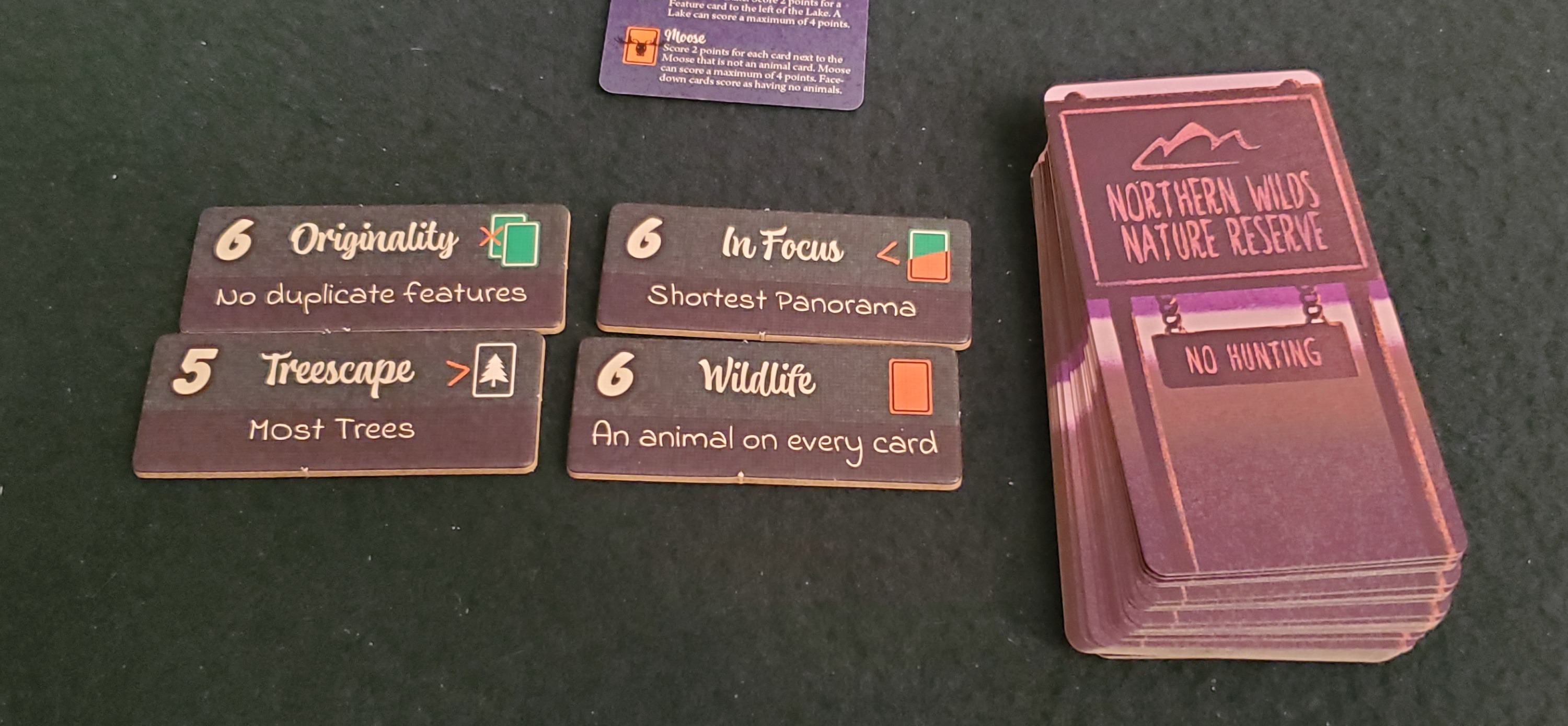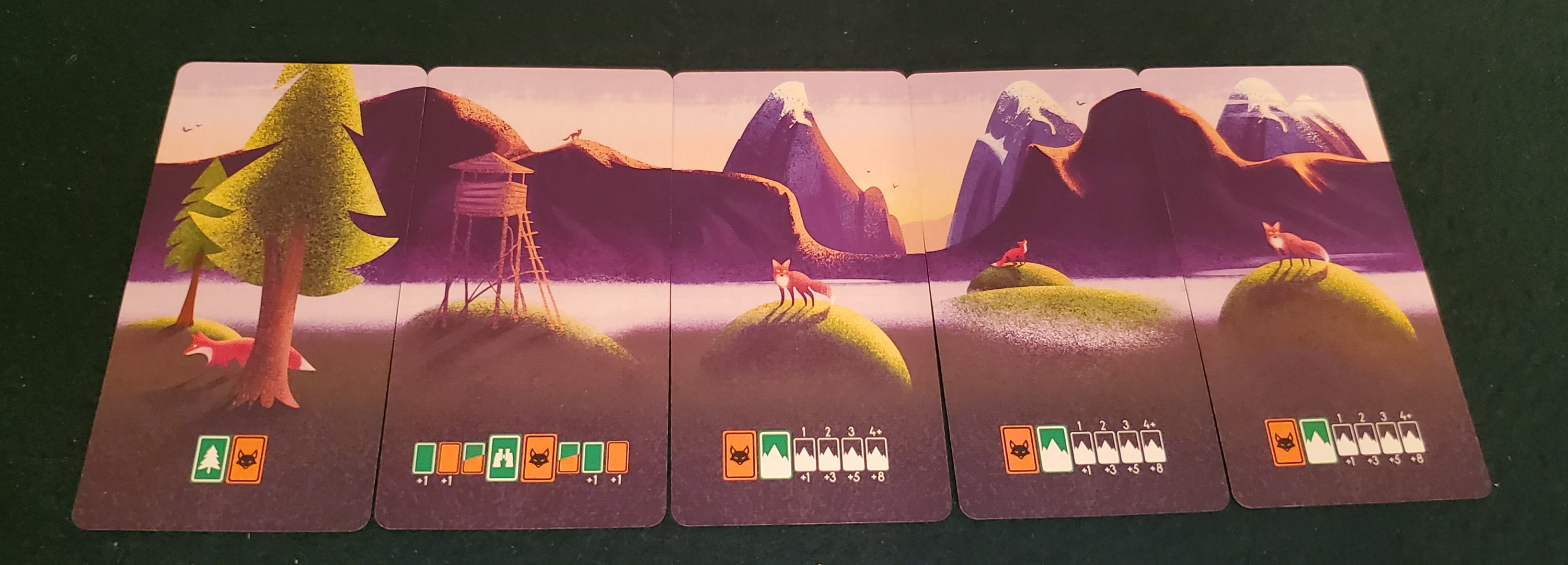 No, really, Panorama is designed to be played twice in succession, from two separate decks, both in coordination (but not cooperation) with your neighbors. First you play through the dusk deck, then slide those panoramas to the side — they’re quite wide — to make room for the panoramas you’ll build from the dawn deck. The icons are slightly different, but what’s more surprising is how similar they are. The same foxes, the same moose, equally unengaging adjacency bonuses… gone are the bears, but by that point our eyelids were so droopy that we might have missed them if they’d shambled through the living room.