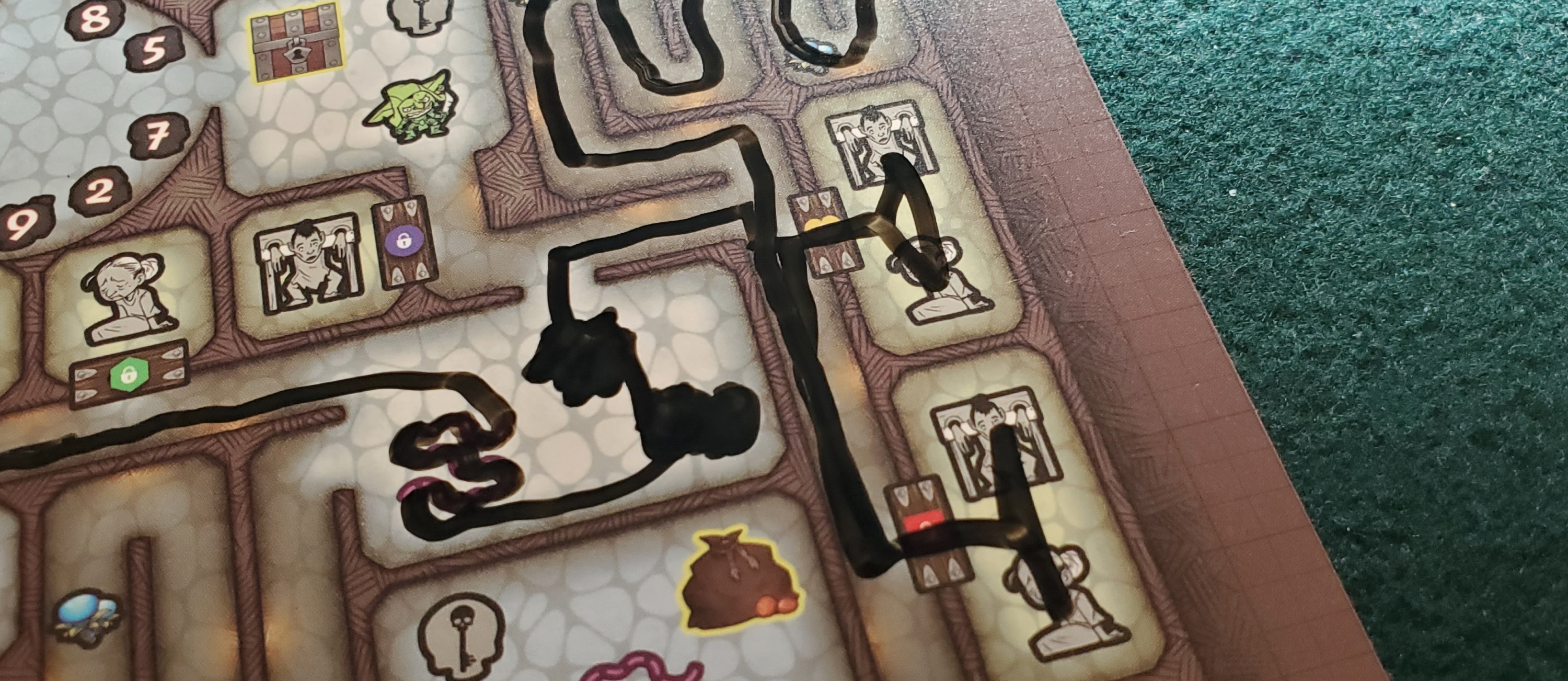 There’s no point softening the blow. Among adults, these matches are as insipid as they are brief, the equivalent of finding oneself in a dentist’s office with nothing to read but ten identical copies of Highlights Magazine’s Best Mazes of the 1990s. There are plenty of reasons why I play board games, ranging from companionship to pleasant time-whiling, but there’s usually some degree of mental stimulation involved. Which is to say, I don’t play games to feel more bored. Alas, that’s exactly the mood Dungeon Scrawlers evokes. Want to observe how two minutes can dilate until you can observe motes of dust suspended in the air, see the beating of a hummingbird’s wings, and meditate upon your own cellular division? If such a psychological awakening sounds intriguing, might I recommend Dungeon Scrawlers?
