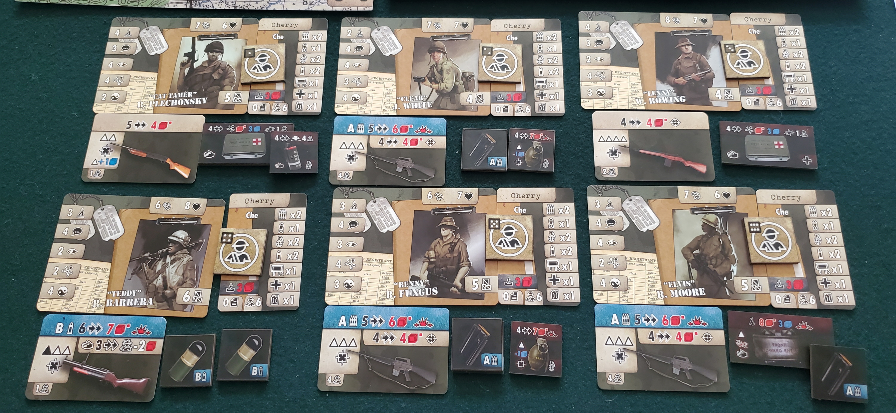 Why? That’s harder to pin down. Maybe it’s nothing more eventful than timing. Maybe it takes years and decades for a medium’s culture to reach that point, like Rhett Butler’s 1939 “Frankly my dear, I don’t give a damn” and Lucille Ball smooching Ricky Ricardo in 1951. Maybe I’m stuck with an expectation that board games must be simple things with black-and-white morality. Or even white-and-white morality. Another option is that Purple Haze isn’t written nearly well enough, at least as a rough draft, to earn such a moment. Somewhere between the repeated sentences, the stilted descriptions of jungle greenery, the very accurate but also very distracting ease of “fuck” as a carry-all term, I wasn’t expecting Purple Haze to confront me with this. It isn’t that I want the actions of my soldiers whitewashed or valorized. I’m not looking for mere heroism. I’m not even looking for “fun.” But that threat reached off the table and slugged me in the nose. If this were a Tim O’Brien novel, I would give myself over to his care completely, so deep would be my trust in his ability to reveal something true or senseless or both. In Purple Haze, my Marines threatened rape to compel a village headman to cooperate, and the consequence was that we had better intel when at last we crept up on an enemy camp. In game terms, that meant ignoring a combat card’s special ability.