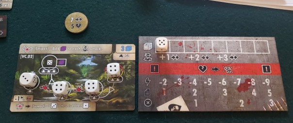 Another layer. Combat only occurs a few times per scenario, but it’s hard-hitting and full of tough decisions. There’s even a raw-boned viscerality to the process. Viet Cong soldiers are represented by dice on tarot-sized combat cards and their attacks are abstracted as chits drawn from a bag, but they strike fast and hard, wilt in the face of your superior training and firepower, and then disappear again into the foliage, often leaving both sides smarting and wondering who got better out of the engagement. If you weren’t so busy patching up your wounds, you might even discern that they’re just as terrified as you are.