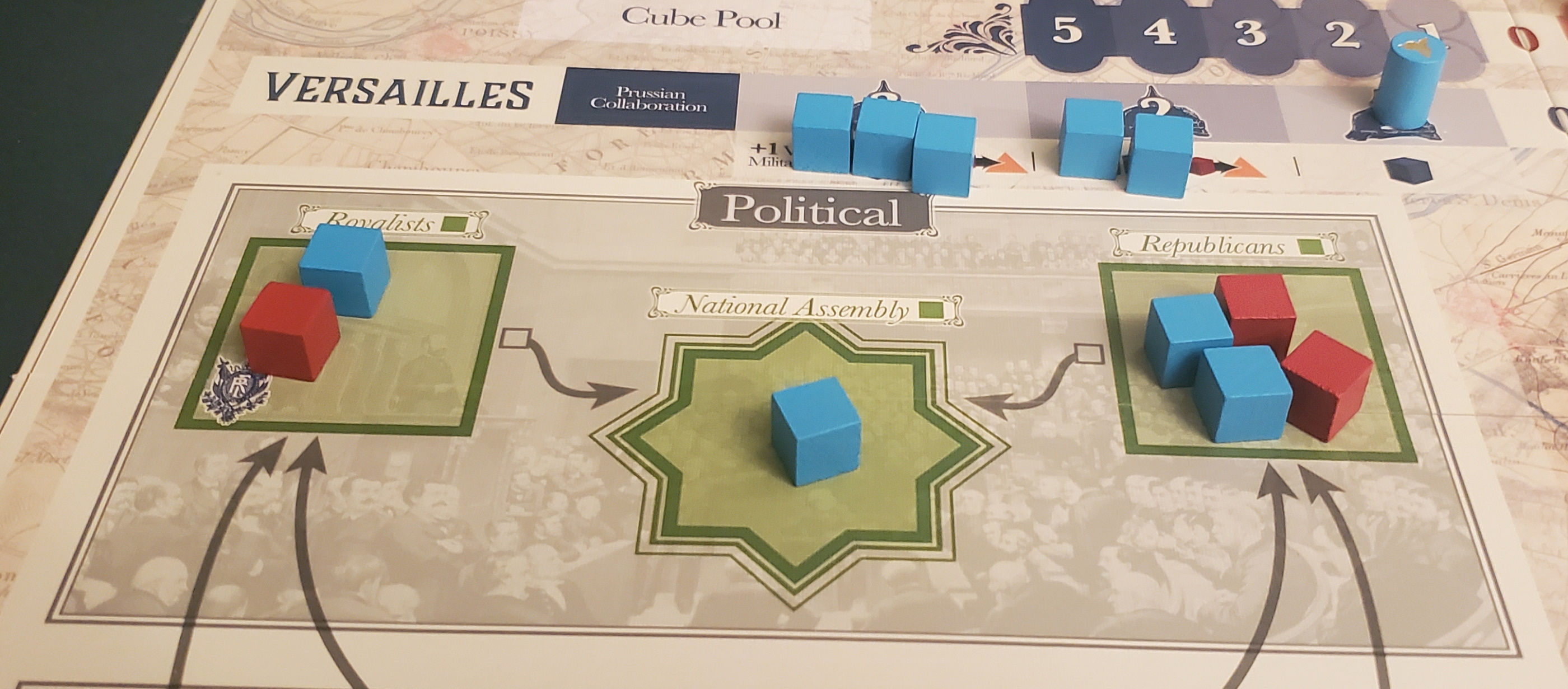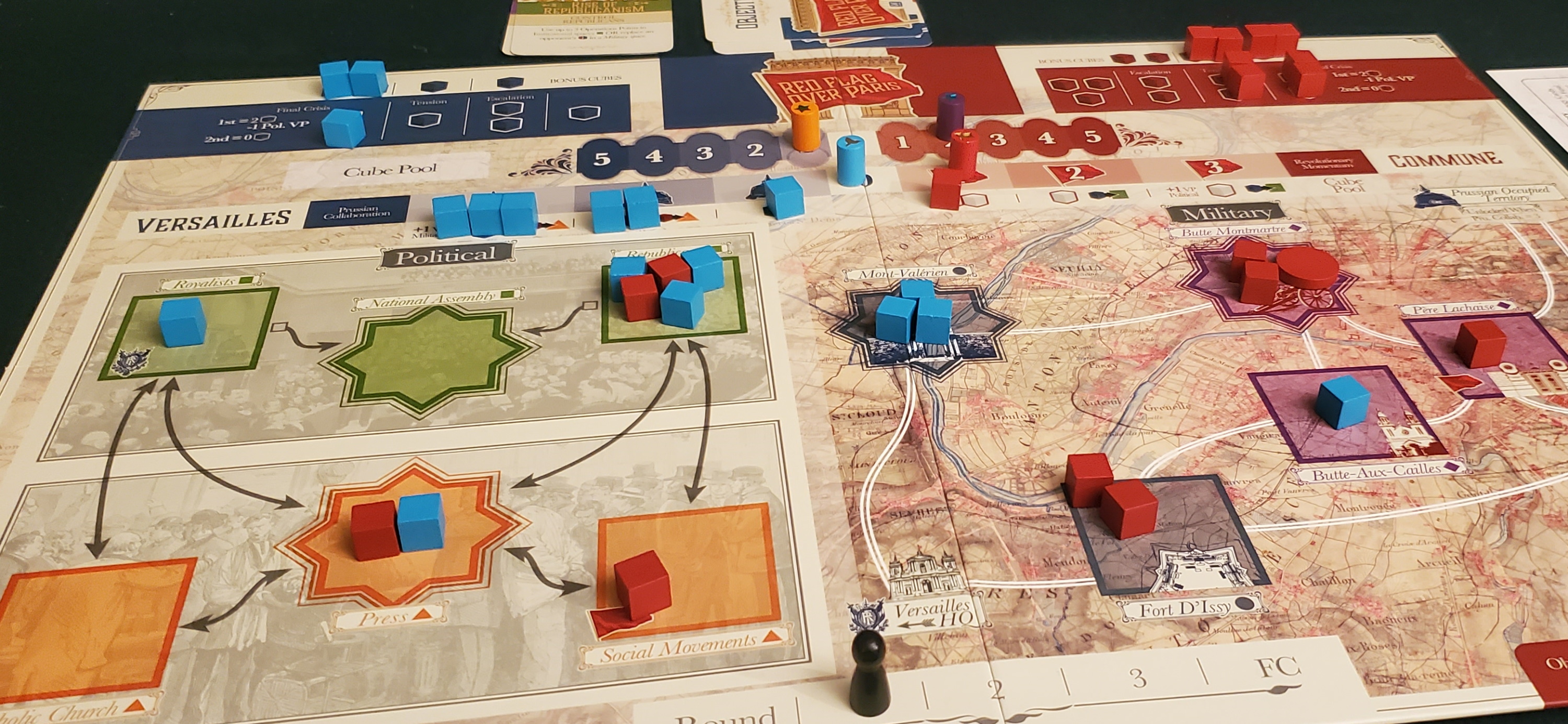 From its earliest stages, Red Flag Over Paris proves that it’s no mere copycat of Fort Sumter. In fact, it’s so far removed that the familial resemblance is limited to the cheekbones. Both partition their map into “crisis dimensions,” spheres of conflict that frame the ongoing struggle by providing periodic bonus actions and victory points. Here, however, those dimensions are further divided into military and political halves. Each operates according to its own character: where influence in the political realm is fickle, cubes entrenched on the military side of the board must be pried out, by the tip of a bayonet if necessary. The relationship between the two games only grows more distant from there.