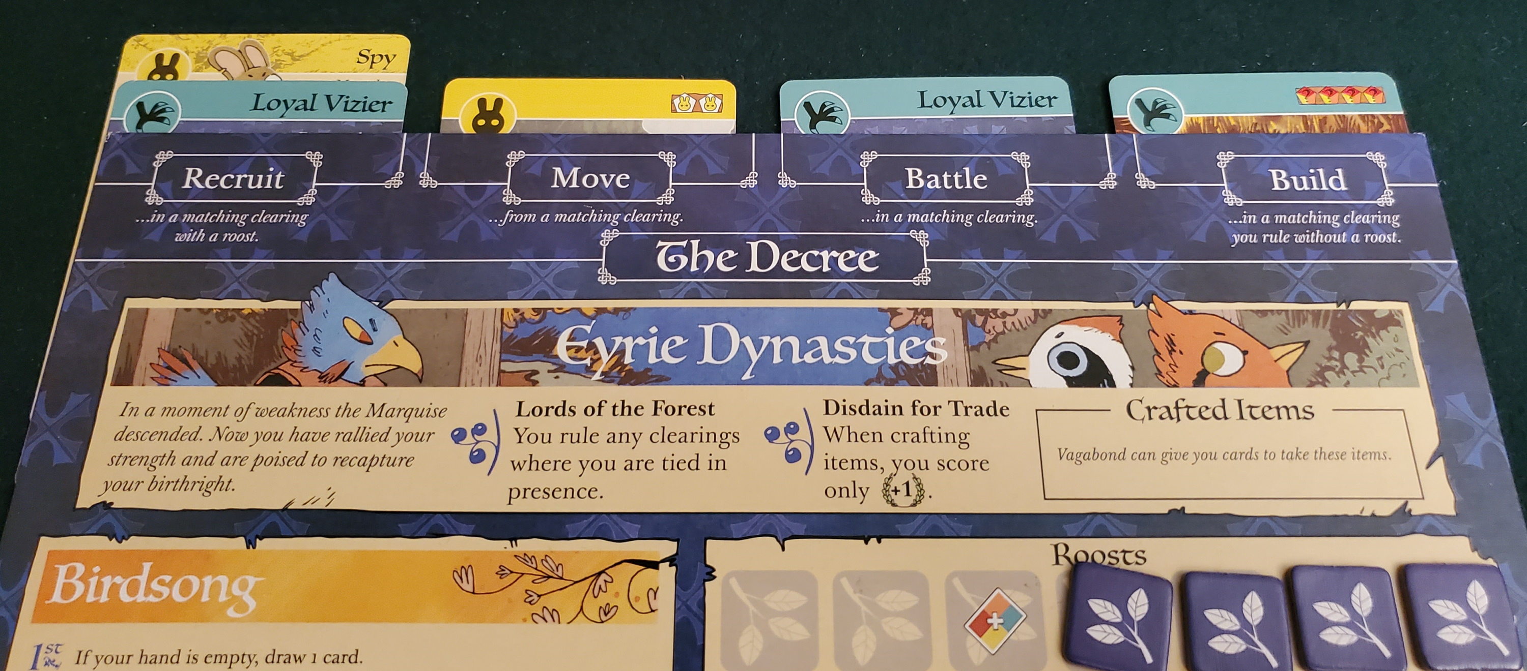 More than any other faction, the Eyrie Dynasties are all about population control. One wonders if they always ruled this way, as a direct illustration of Foucault’s double-edged definition of power. More likely, perhaps they carried on in the manner of our own old aristocracies, lording their titles over medieval fiefs. In such a reading, the reason biopower is written so directly into their behavior is because as the woodland’s oldest regime they’re also its newest to the game of parlaying power with the small folk. Where the Marquise de Cat has learned to leverage industry and the threat of force and the Woodland Alliance responds to the small folks’ outrages with revolution, the Eyrie must negotiate with its people. Of course, they couch these negotiations beneath a cushion of terminology. But as steadfastly as the flighty folk call it a “Decree,” nobody but the most gullible think it carries such unyielding authority.