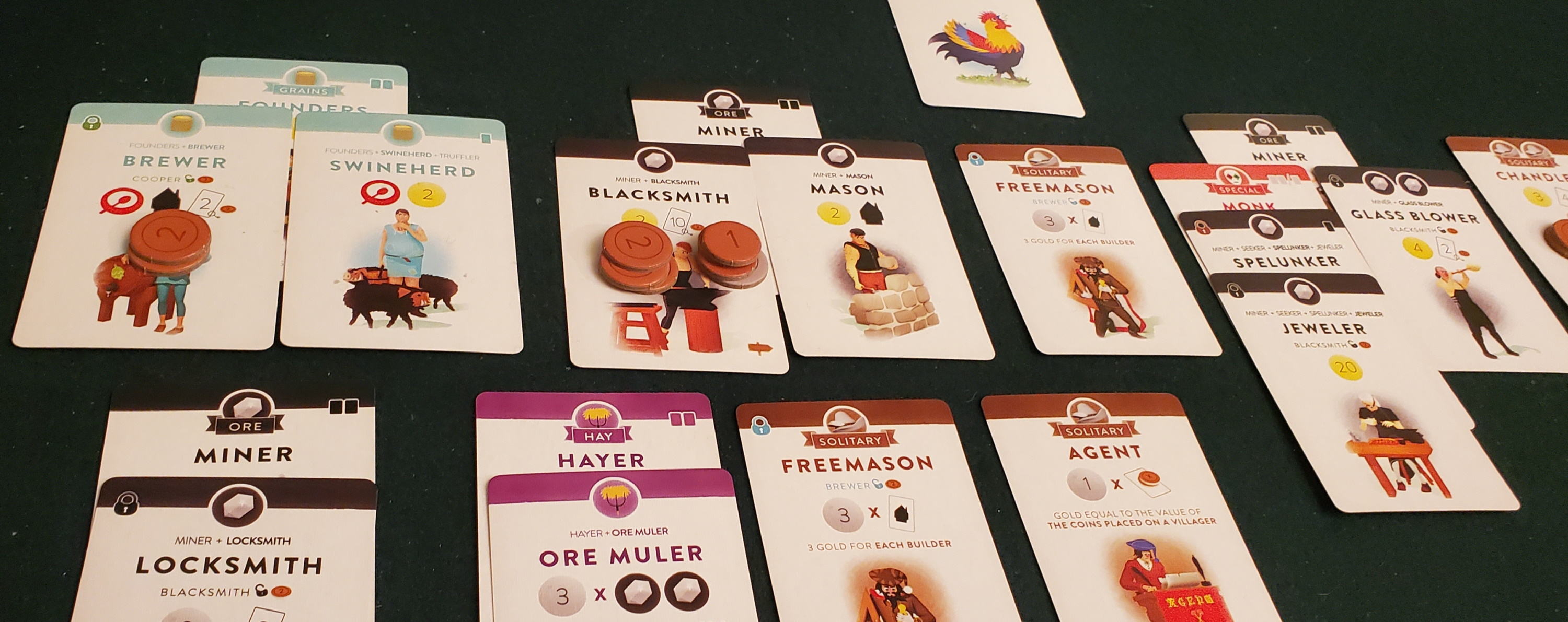 This elevates the entire drafting phase. You’re not only grabbing whichever card looks best. You’re gambling on suits. There are just enough cards that it’s worthwhile to grab a card matching a suit you’re interested in, without it ever becoming guaranteed that you’ll get exactly what you want. Continuing with the lumberjack, maybe your gamble pays off with a cartwright. His income is considerable, but he can’t be placed directly atop a lumberjack. Instead, he requires an intervening wheeler. That is, unless you happen to chance upon someone special, like a monk or an apprentice. Now you’re presented with a conundrum. Double down on wood? Hold onto the cartwright just in case? Or force the poor guy to bale hay so you can pursue another objective?