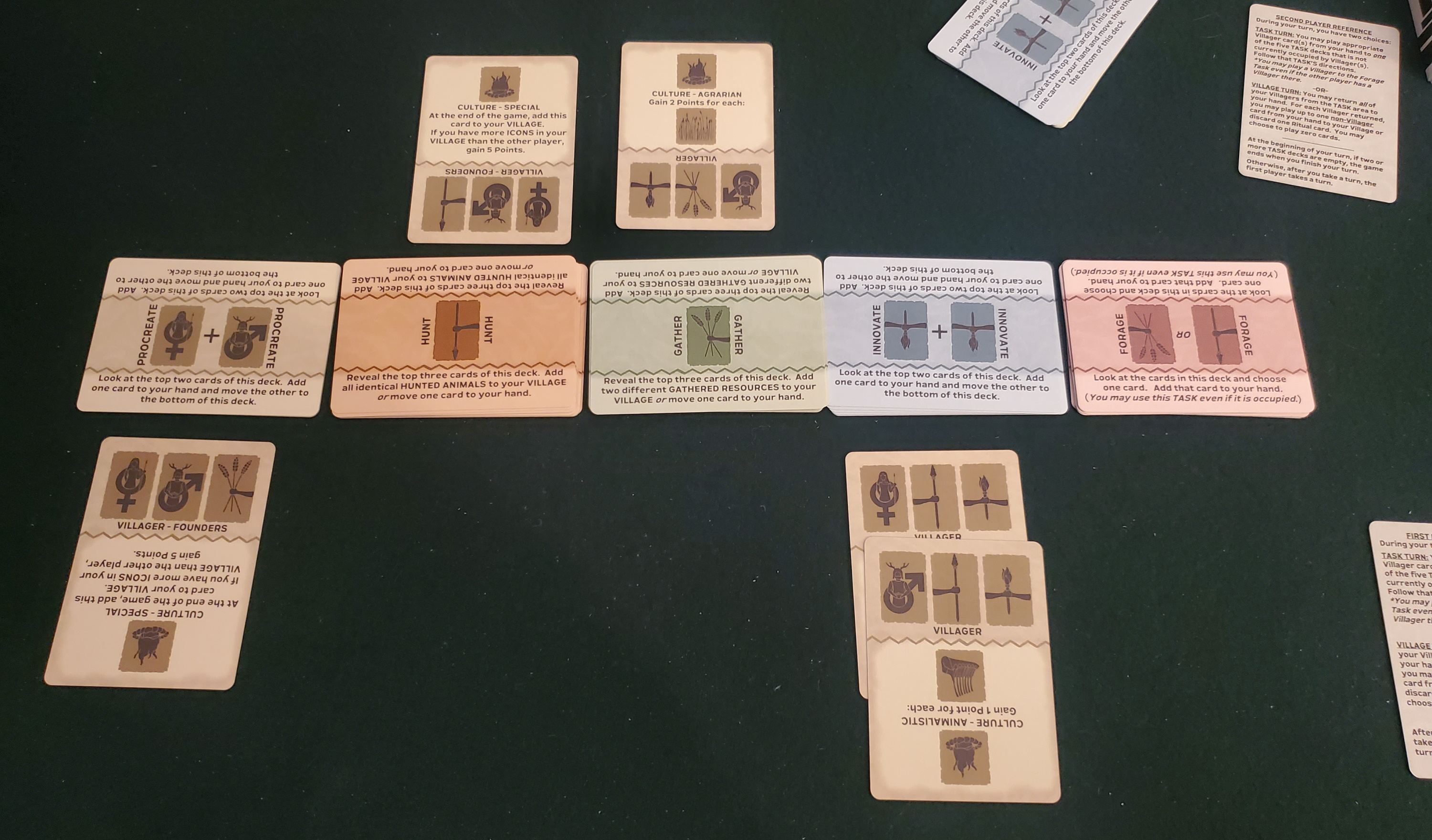 First, there’s the method. Neolithic functions like a worker placement game. You deploy villagers to a row of offerings, each with its own method for picking up cards. Hunting, for example, lets you draw three cards and keep any duplicates, while Gathering lets you store two dissimilar resources. Bronze Age is more of a buffet: there are three piles of cards, any of which can be freely plundered. The Middle Ages emphasizes the leanness of its era. There’s only one pile to draw from, but there are many ways to plumb more deeply into its wellspring, including the occasional trade between neighbors.