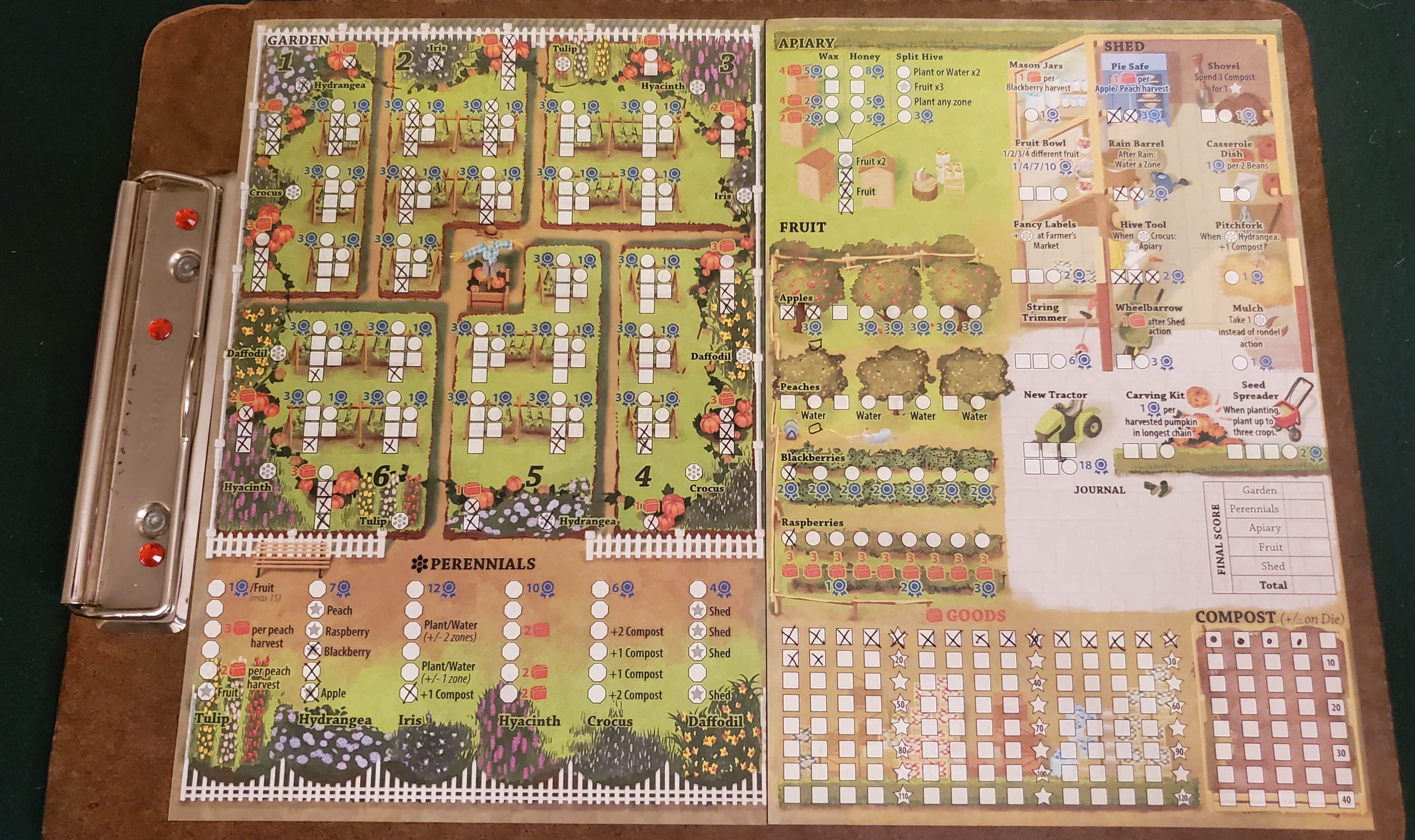 This isn’t to say there aren’t good things happening in Three Sisters. It has a lovely little rondel action-selection system. Each player claims a die, which indicates which of their six gardens they’ll work in, plus the printed action the die was sitting on. After that, everybody at the table also gets to use the lowest die and its associated action. Oh, and also the end-of-round action. Okay, so it’s a lot. I already said that part. But picking your action from the rondel feels like exactly the right sort of decision. Compact but impactful. Comprehensible but worth studying for a moment. It even replicates the whole “shared input” thing most roll-and-writes are doing without actually requiring identical inputs for everybody.