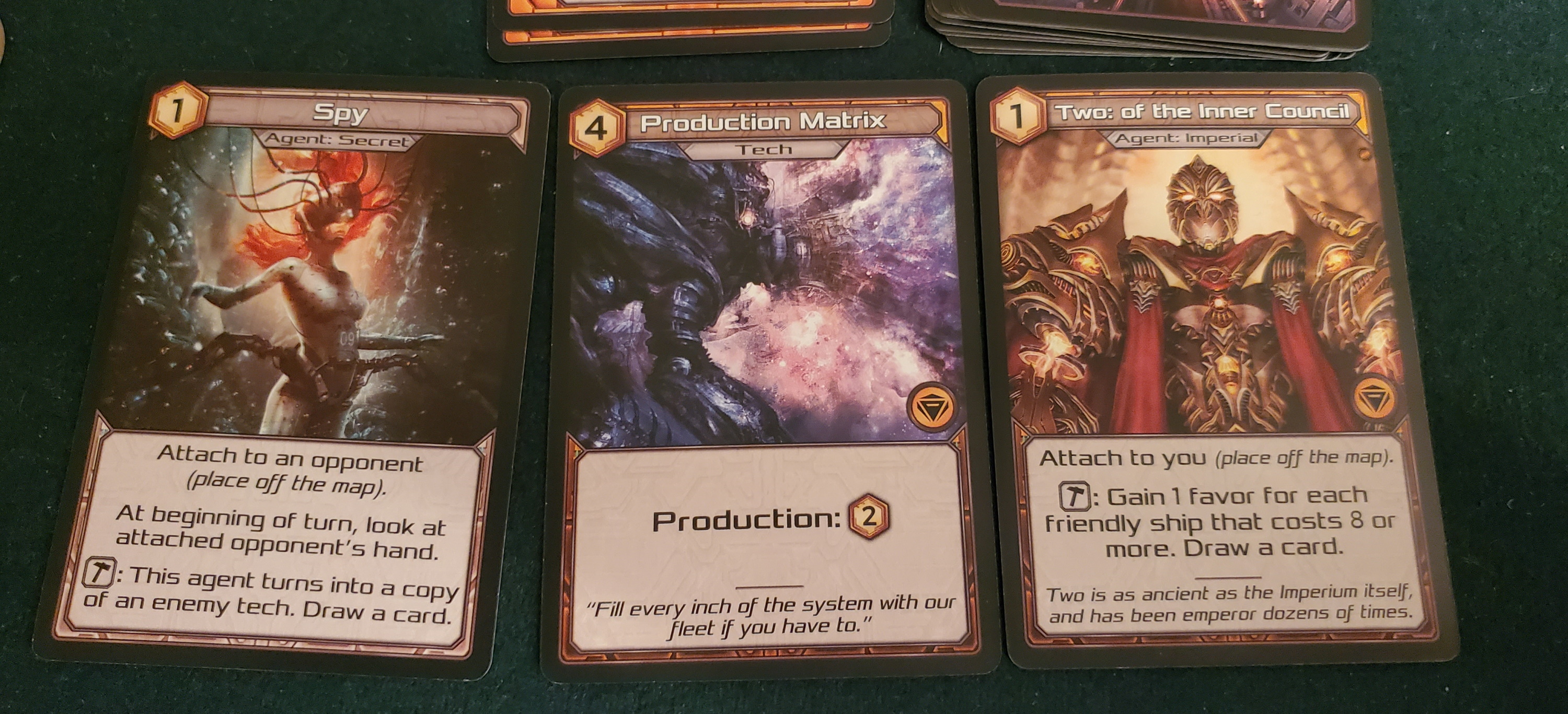 I mean that. The “maybe” part, because I haven’t done more than root through the extra cards to see what’s in there. But I appreciate Dworetsky’s approach. Imperium comes with six pre-built empires, each with its own ships and tactics and techs and agents. More importantly, each empire also has its own deficiencies. Expensive ships, or too few options for disrupting opponents, or a serious lack of manufacturing capability. That’s where the extra cards come in.