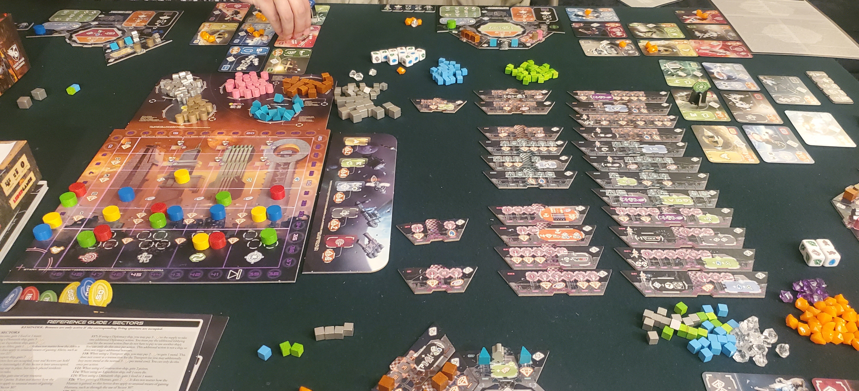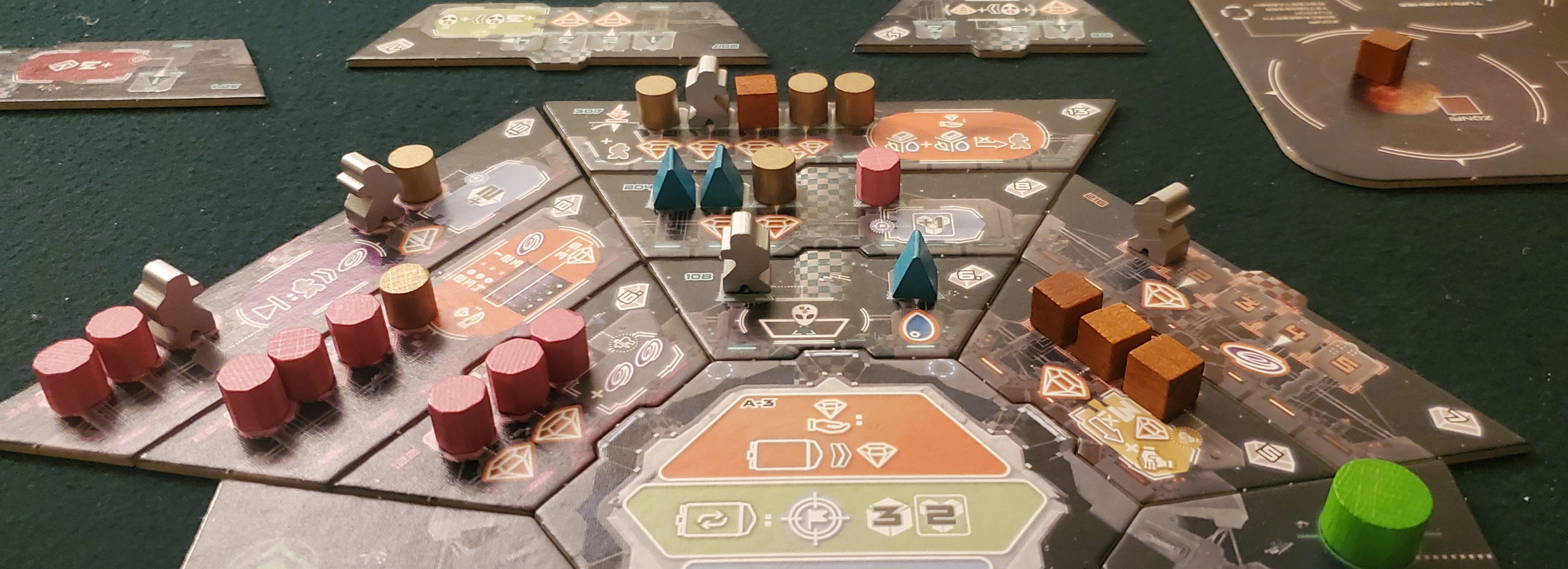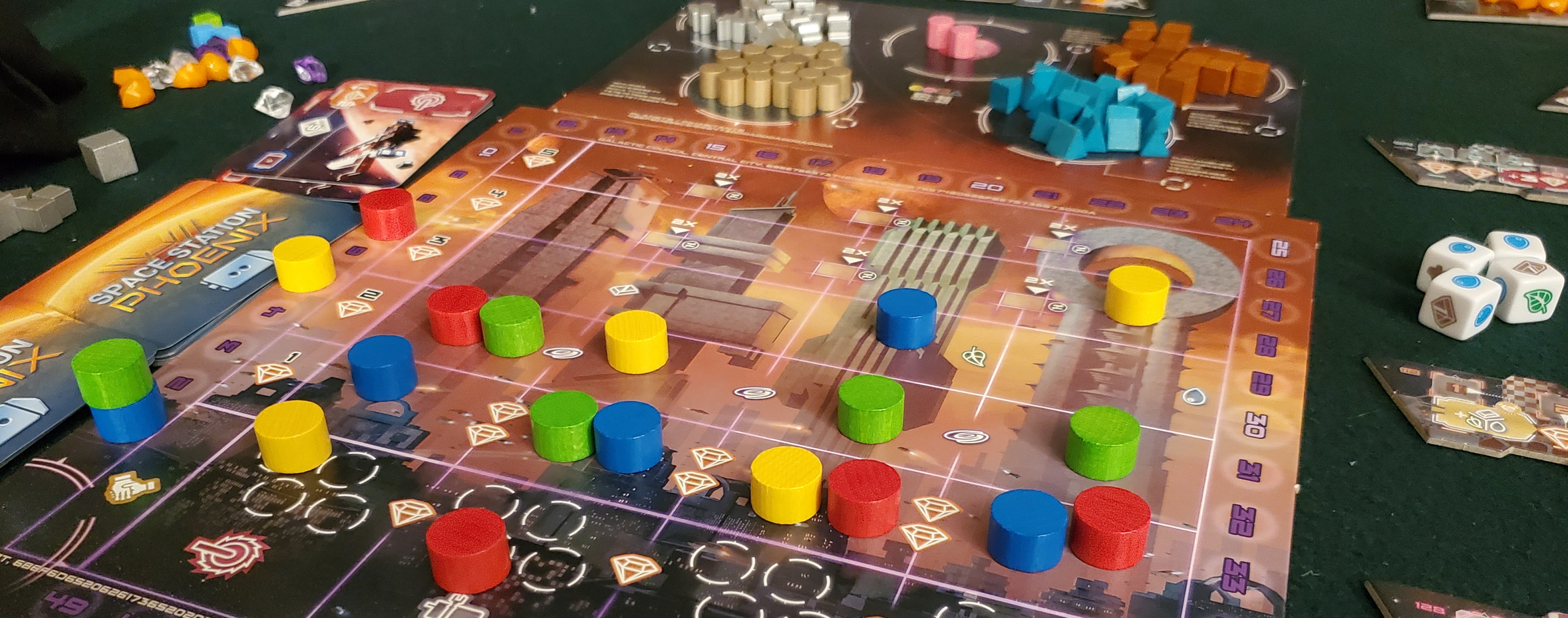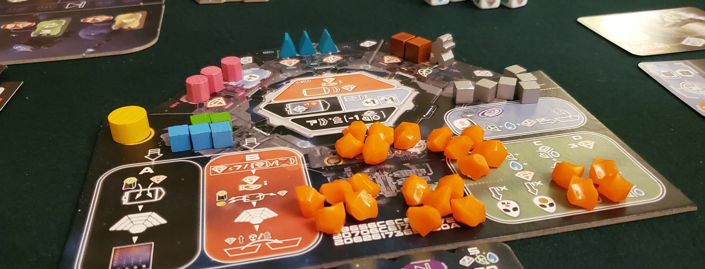 But that’s not all! Did we already utter that phrase? Indeed, Space Station Phoenix has a tendency to go on like that, folding systems over one another and spooling its duration outward. Like a mechanized representation of Newton’s Third, nearly every action in the game also triggers a reaction. This is managed via the diplomacy board. Here, players compete for preeminence, using limited diplomacy ship slots and waning crystal reserves to propel themselves along a series of tracks. Whenever the corresponding action takes place, everyone earns some bonus depending on their relative position. The rules are persnickety: you only earn the bonus for your space if you’re in first place, otherwise you’re required to claim a bonus from a lower slot. The effect on the tempo is stuttering: for a game that allows its players to plan the blueprint for their station many minutes in advance, it certainly loves to intrude into those preparations so you can gather one more crystal. Or worse, ask what everybody’s action was this past round so you can gather one crystal. After a few too many missed plays, we took to bellowing our selected action across the table. “Scrapping!” “Trade!” “Building!” When everybody’s hamster-feeder income relies on the accuracy of your pronouncements, conduct take-backs at your own peril.