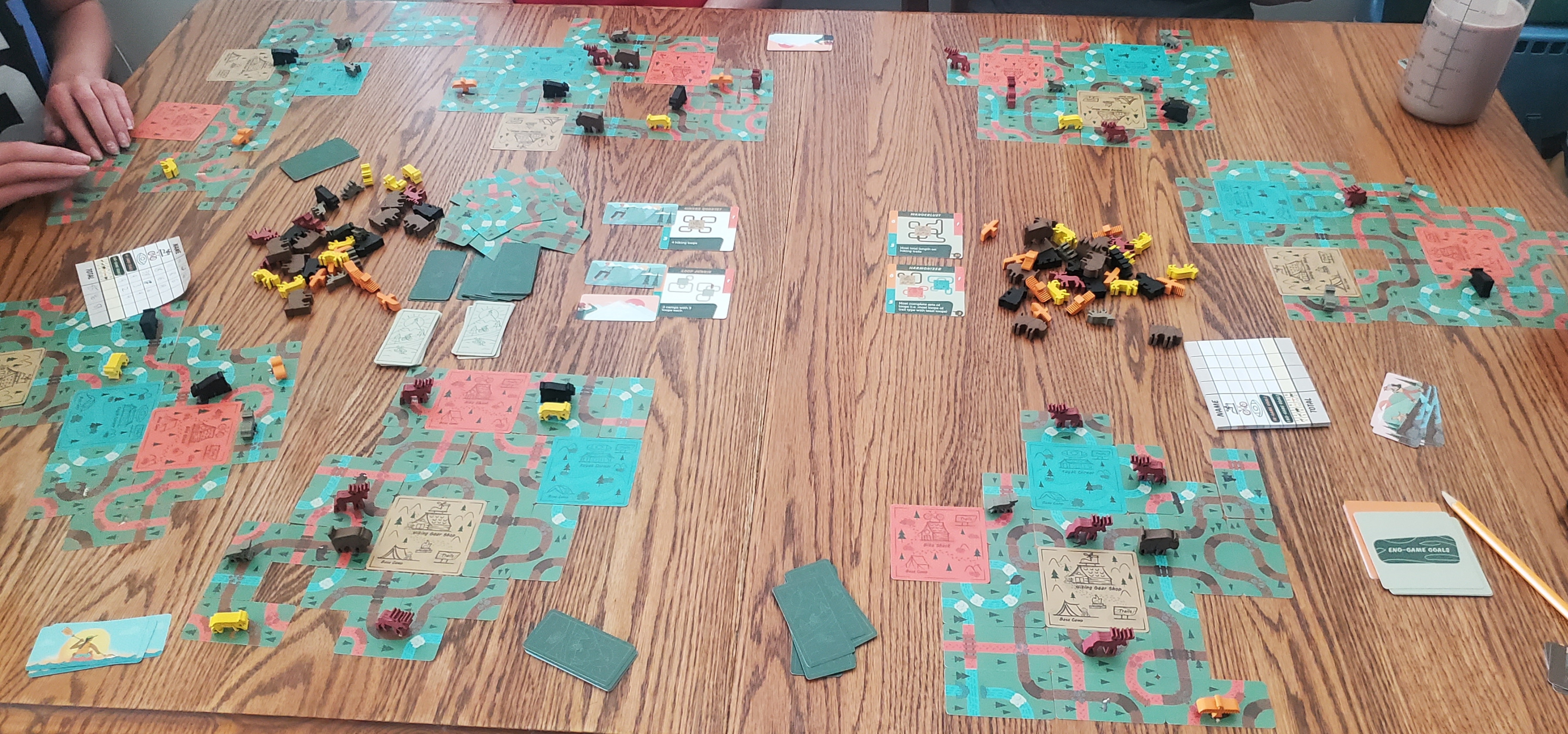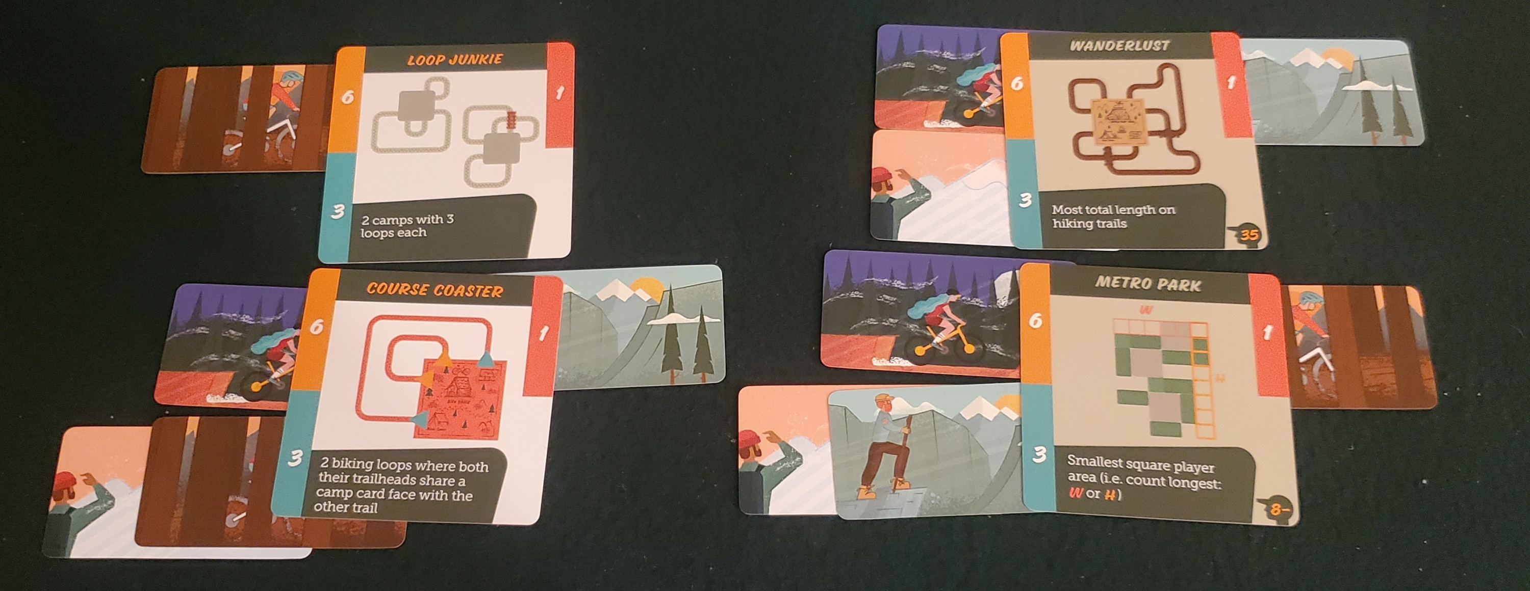 Oh, there are a few minor details to keep in mind. The animals I’ve already mentioned. These can be placed on any trail card that shows them somewhere in the background. They’re optional. That’s important, because an animal on a card means you can’t ever cover it up with another card. Not a camp, not another trail, not even partially. In a game that gets you praying for the right bridge or loop to appear, forgoing the ability to pave over a past mistake is no minor sacrifice. So you pick your animals carefully. You want variety, is the thing. Hikers and bikers and kayakers soon grow bored of seeing nothing but moose. Each loop grows more valuable in proportion to the variety of wildlife along it. That and its length, of course. Plus a few scoring cards, because what would a modern game be without variable scoring. I’m being slightly sarcastic there, but they fit right into Trailblazers. They provide a shared focus between players, a reason to value the same types of paths. As with everything else in this design, they provide nested considerations. It isn’t just about finding cards that work. It’s about finding cards that work in two or three ways simultaneously.