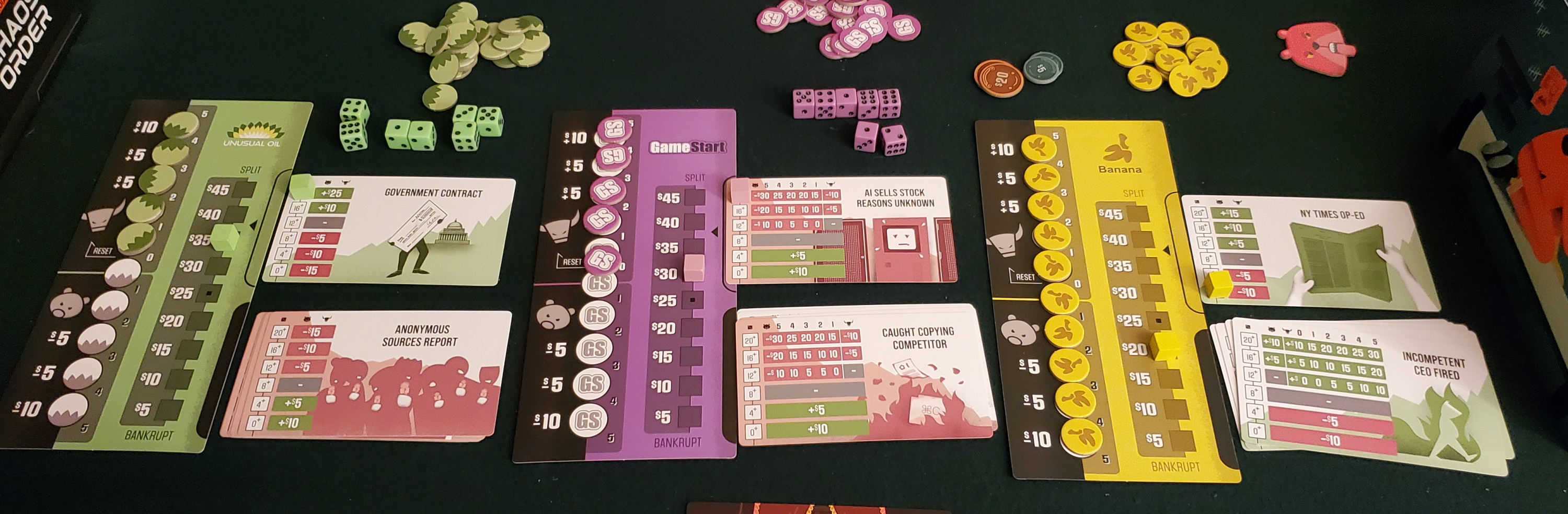 Here’s the problem. Bankrupting a company isn’t a trifling affair. Everyone at the table sees insider info about each company, both this quarter’s crisis and the next. Maybe the CEO’s ex is scheduled for a public interview. Maybe the company is petitioning for a bailout. Whatever the rumor, we roll that company’s dice, compare it against the rumor card’s grid, and adjust the stock value up or down. But! The company’s pool of dice is fungible. We can bury dice. We can keep dice hidden behind our screen. Or we can flood a company with dice, potentially (but not guaranteedly) altering its value.
