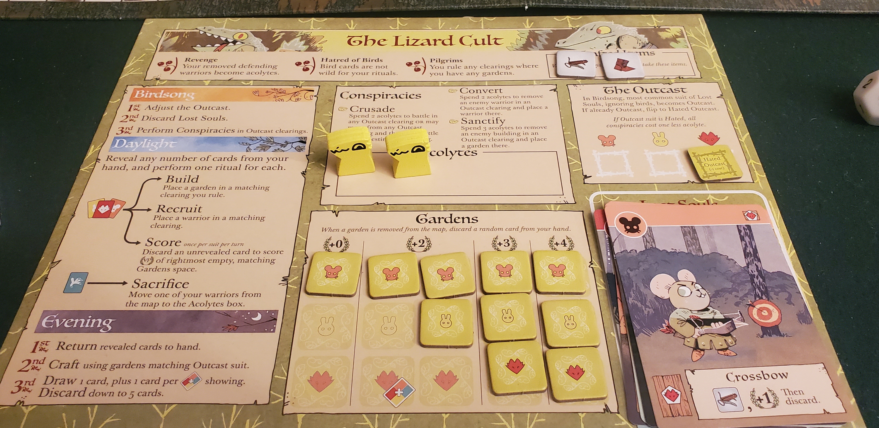 On the surface, though, the Lizard Cult is concerned with the plight of the Small Folk. Their closest analogue is the Woodland Alliance, and even the Alliance’s compassion is limited to the cards “on the table” rather than those who’ve been outright dispossessed. The Cult is willing to think outside the box. Whenever a card is used, it gets deposited in the Lost Souls pile. Whether that’s because they’ve been worn out crafting, injured during an ambush, or overworked in the Marquise’s mills. When the Small Folk fail to find a niche within the woodland’s ecosystem — or worse, when they find a niche only to discover that their newfound position is only as permanent as their endurance — the Lost Souls pile is their layover. Then, when the Cult’s turn rolls around, the most common suit among the Lost Souls becomes “outcast,” a favored group that will be the focus of their ministrations for the duration of the turn. Squint hard enough and the Cult seems to be doing benevolent work. They score by planting gardens. They don’t scrabble for territory quite as jealously as their opponents. They don’t even have a regular action for attacking. Put all that together and they seem downright monkish.