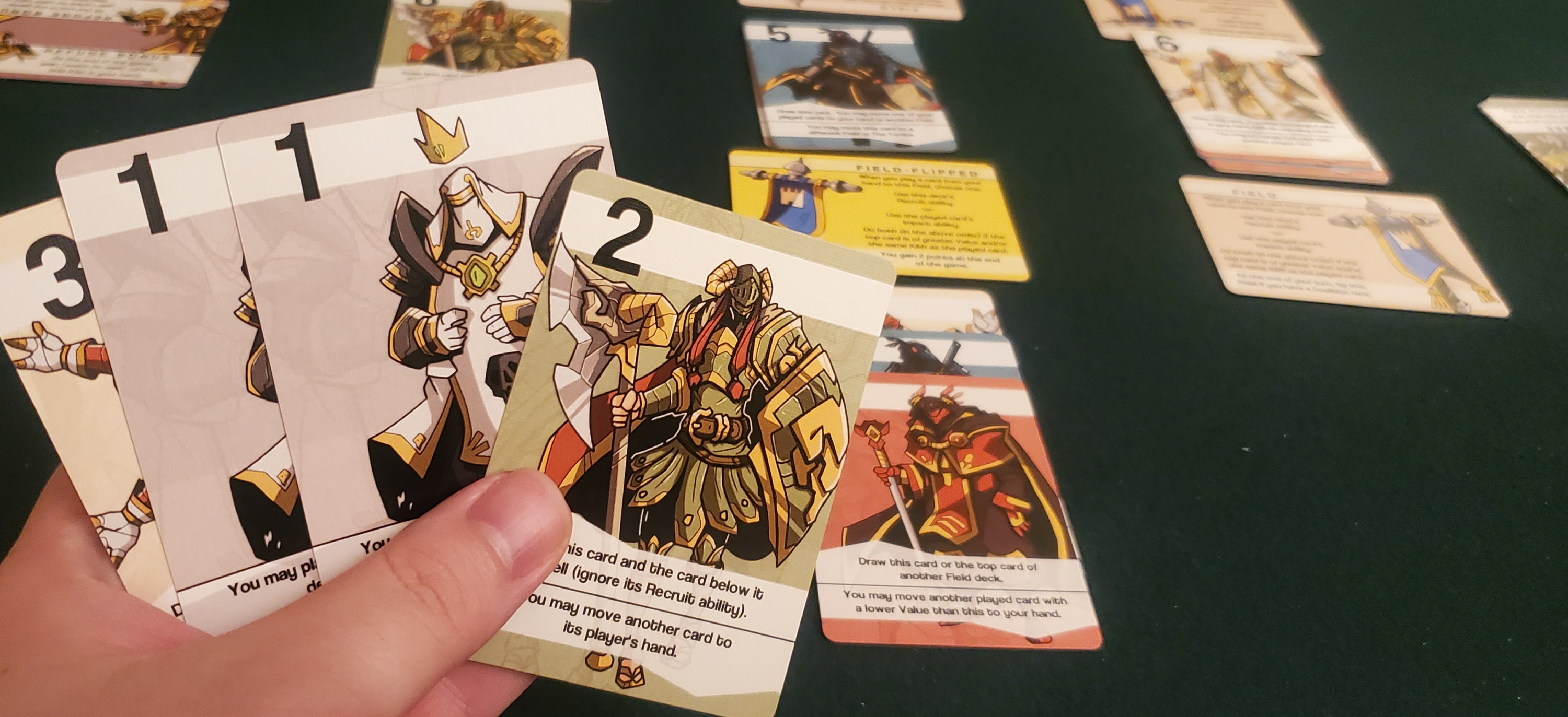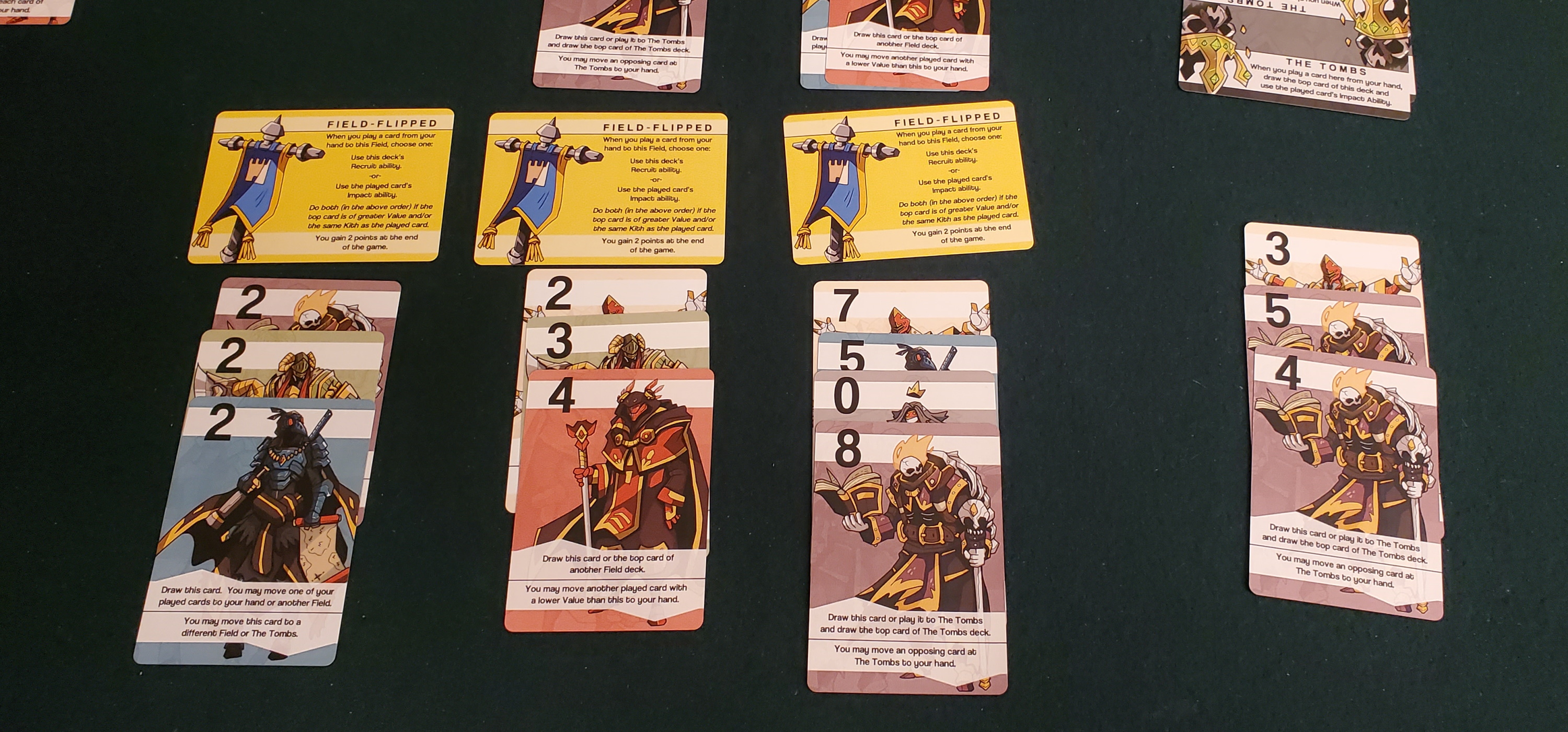 That’s another difference between Omen and An Empty Throne. Here, there’s no drafting. It isn’t even an option. Your hand is crafted over the course of play. The four locations — three fields plus the tombs — each hold their own brand of cards. Fields hold the “normal” five suits, face-up, ready to trigger their abilities, while the tombs are full of buried secrets, alternate suits with powerful abilities or mismatched numbers that don’t readily make sets. Crafting your hand is holistic. There are the cards you can see, cards you can’t, and even opposing cards. Did I mention that cards are never discarded in An Empty Throne? They aren’t. Once played, they’re in play forever. At most, they might bounce back into somebody’s hand. But they’ll never disappear from the table entirely. Every play therefore cuts both ways. Any card you place can be stolen away, swap sides, get used against you. Even though cards can’t be discarded, there’s little permanence. Something else it has in common with Omen, although it arrives there circuitously.