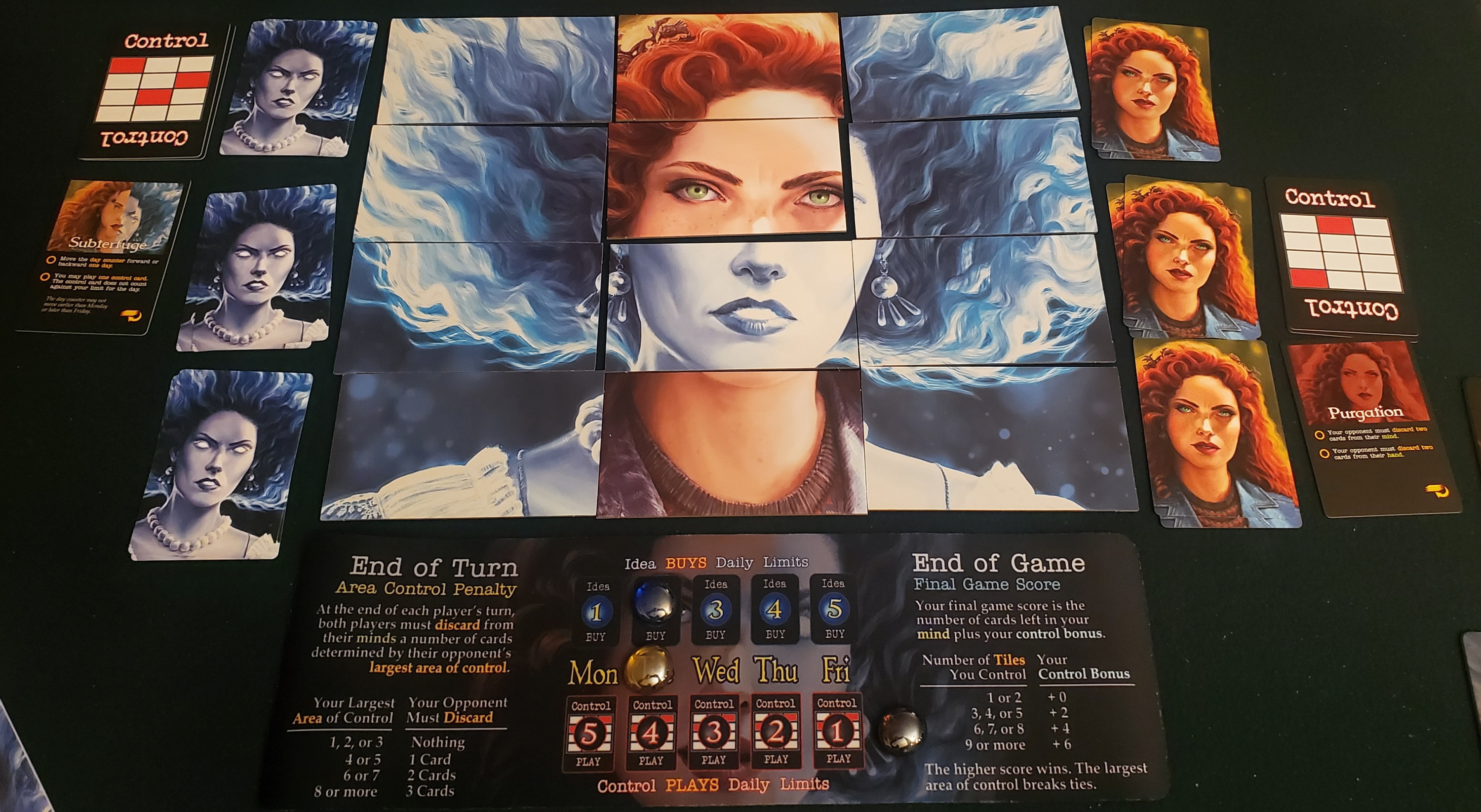 I’m often fascinated by descriptions of alien things, objects or actions so unfamiliar that we lack the vocabulary to describe their usage. The Mirroring of Mary King falls under a similar category. While its movements are magnificent to behold, there’s nearly no antecedent. Oh, there are power cards, decks and discards, tiles to flip, tracks to advance. It is recognizably a game. But it’s a game that moves to an ephemeral rhythm.