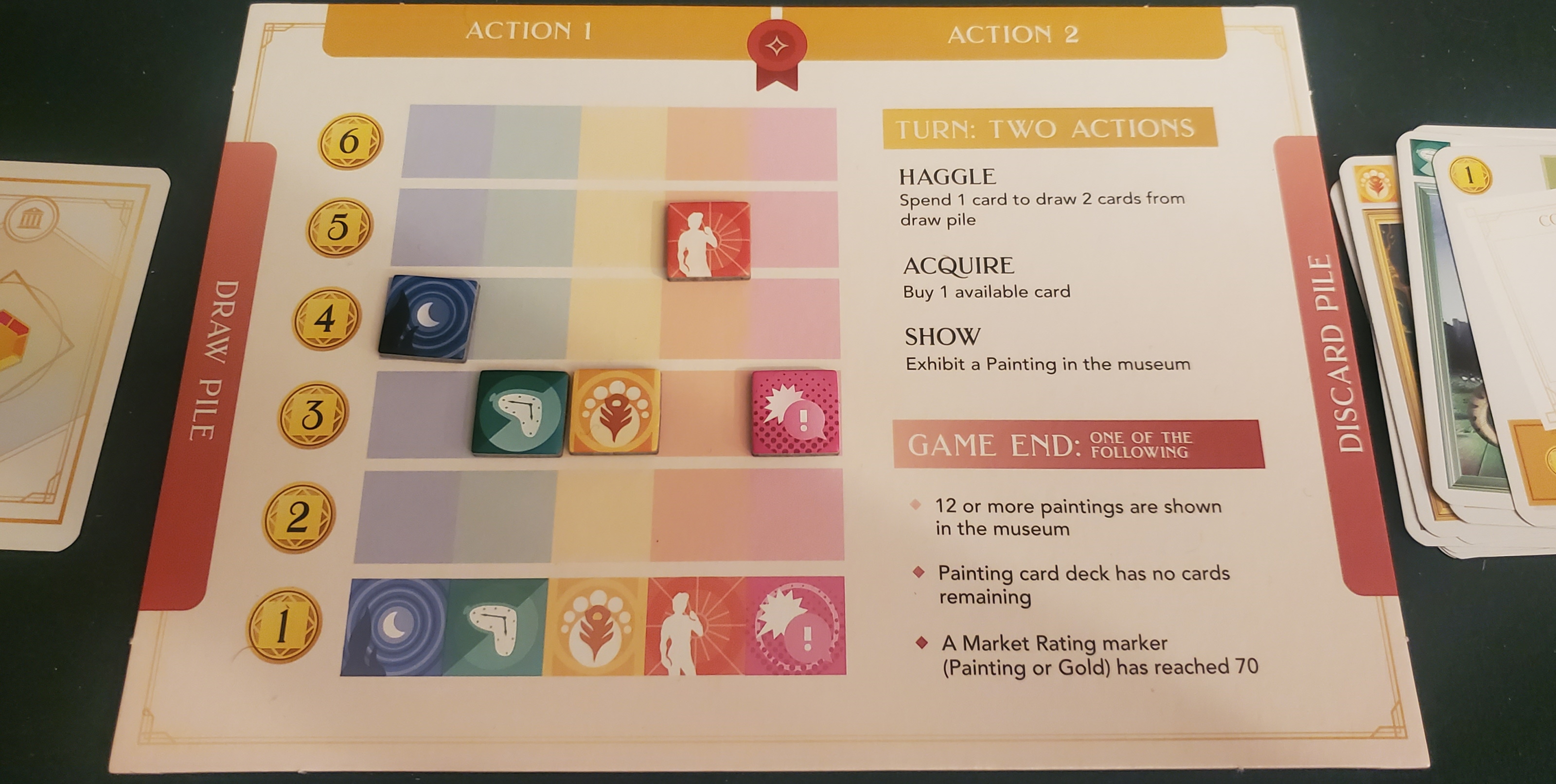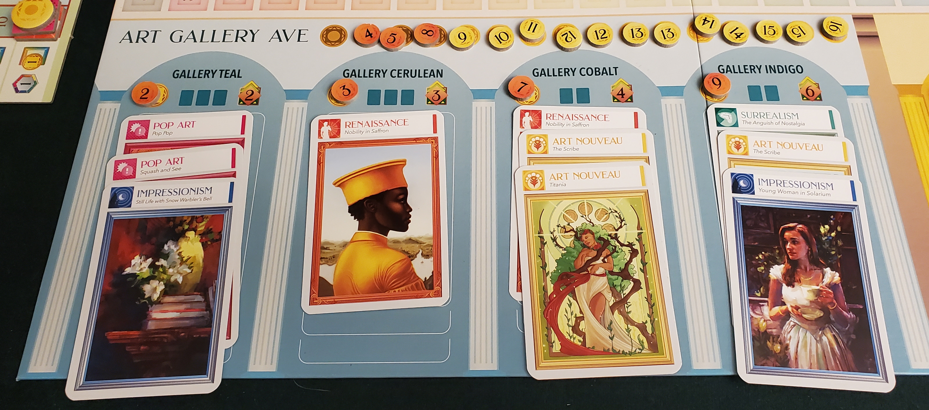 Art cards, meanwhile, defy the usual descriptors. Unlike other deck-building games that emphasize process — Dale of Merchants, Valley of the Kings — art cards aren’t associated with abilities. It’s easier to think of them as colors or suits instead of as discrete cards. There are five: impressionism, surrealism, art nouveau, Renaissance, and pop art. You may as well conceptualize them as blue, green, yellow, orange, and pink. When you purchase something, its corresponding type increases in value. When you exhibit a piece, the same thing happens but with more gusto. Over the course of many purchases and exhibitions, the value of these types, both in spending power and victory points, gradually ticks upward. One type of painting may soon become so valuable that everybody pounces on them the instant they appear for sale. This, naturally, drives their value even higher. These bubbles never burst, but exist as perpetual energy machines that run until the game ends. When that happens, the winner is derived from both the points they earned from exhibitions and the value of their decks. It’s very mathy, and very abstract, and not entirely unpleasant.