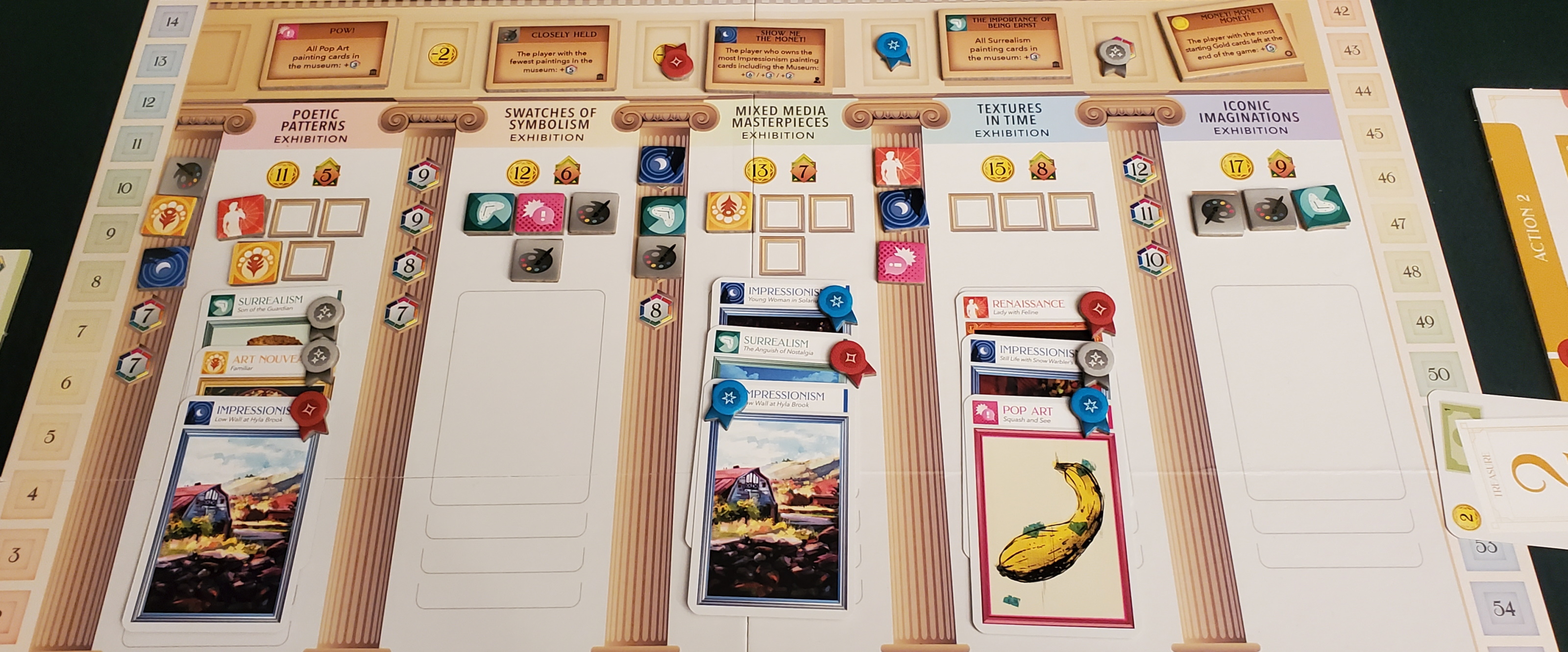 But this trade-off also removes that card from your collection, thereby depriving you of its score. The entire game becomes a search for missing variables. If you exhibit this painting, are you making enough points from the other cards of its type? Or are you handing somebody else more points than you’re giving yourself? Is the slight advantage in exhibition scoring to your benefit, or have you bumped somebody else’s collection up a rung? Is there an off-chance that you’ll unlock that scoring tile, and, if so, will it benefit you more than everybody else?