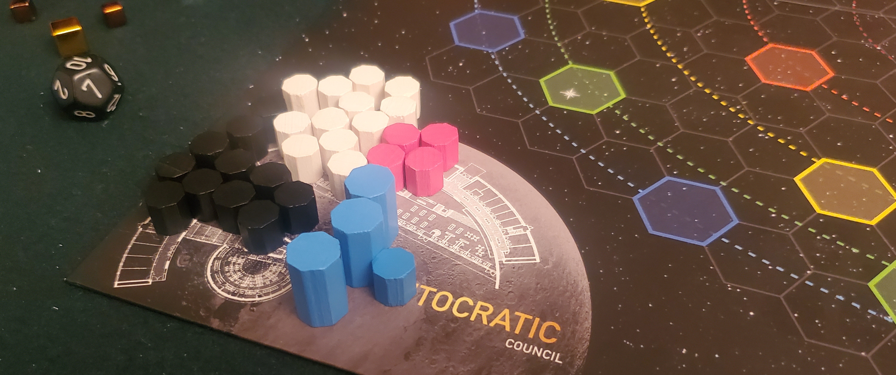 The one thing that really puts a wrench in things is the decision to go to Earth, which in our game happened all at the same time. We were four players, so this scramble filled three of the four societies. So that one really interesting decision wasn’t going to happen again.