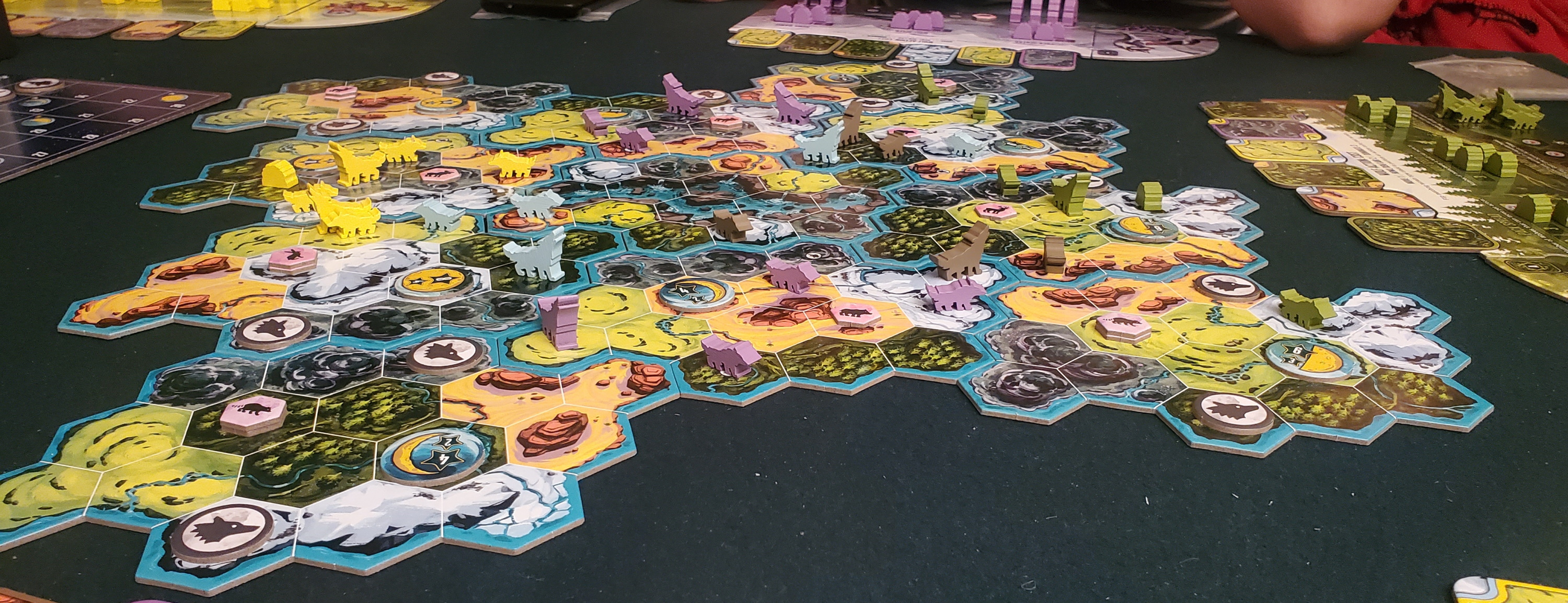 The late player order can be a problem it seems as resources get gobbled up—but it may be that counter intuitive play (giving up the early game to camp the later scoring spots, holding back on hoovering up lone wolves so as not to activate scoring too soon) might help…but leaning on “hey don’t do that thing that it looks like you should be doing” isn’t necessarily a good design choice. Still, I believe this game is like one or two minor changes away from greatness.