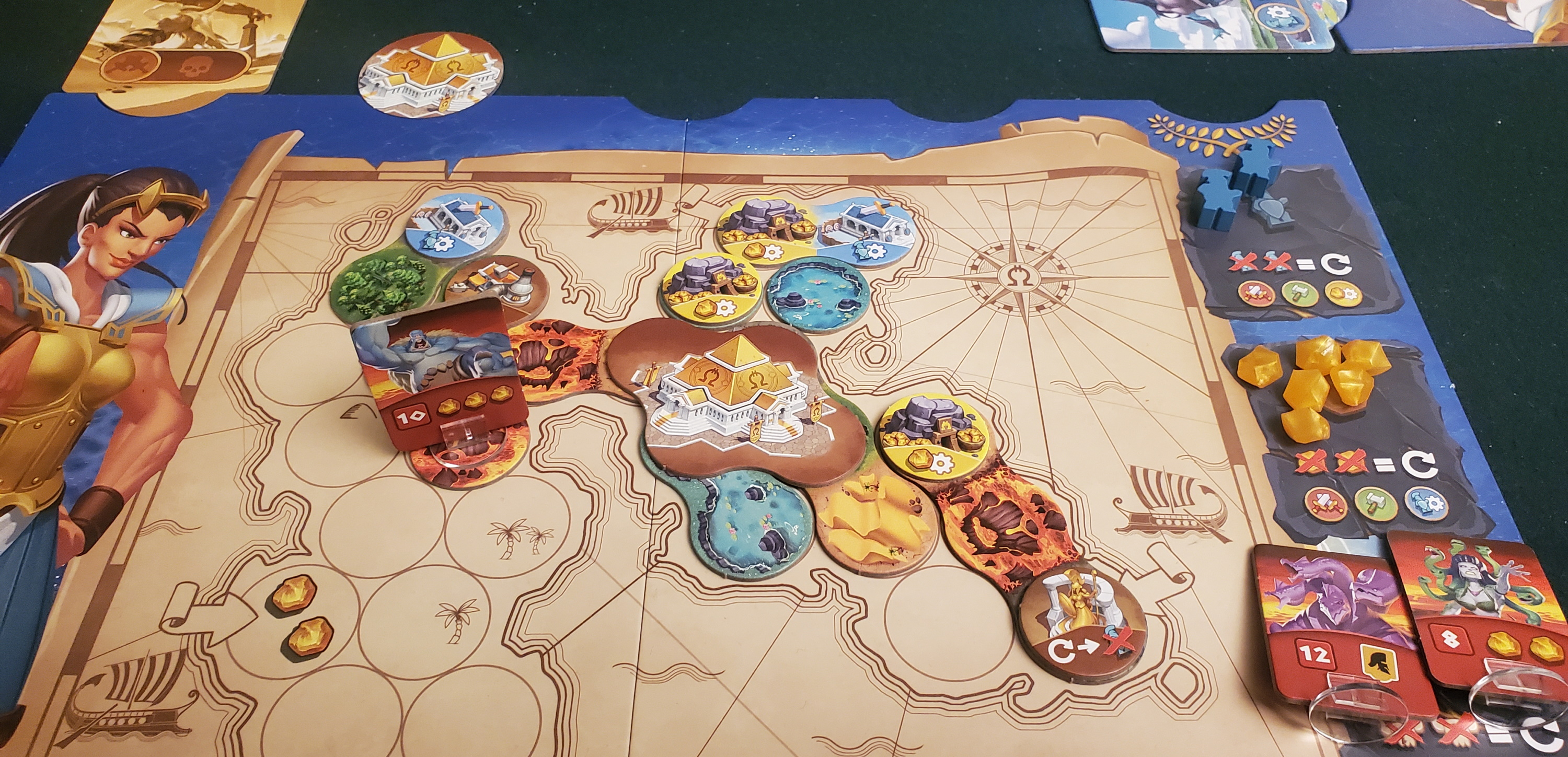 Fortunately, it’s somewhat harder to wrassle terrain into useful arrangements. This latter detail is important, as stretches of similar terrain will bestow the allegiance of titans, victory points that also offer onetime bonuses to various actions, while clusters of four dissimilar landscapes will allow the construction of a temple, another victory point, albeit one that doesn’t do anything cool and stompy. This is where Orichalcum grows a little more interesting. Victory, you see, is a race to five points. There are only three ways to pick up points, each with their own limitation: titans are cool but you can only host one at a time, temples require some careful arrangement of terrain indeed, and orichalcum ingots are made by melting together five nuggets, which stinks because those delicious nuggs are also one of three ways you pay for your extra actions.