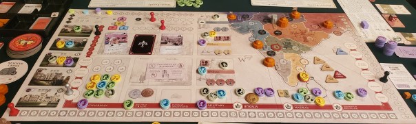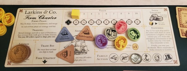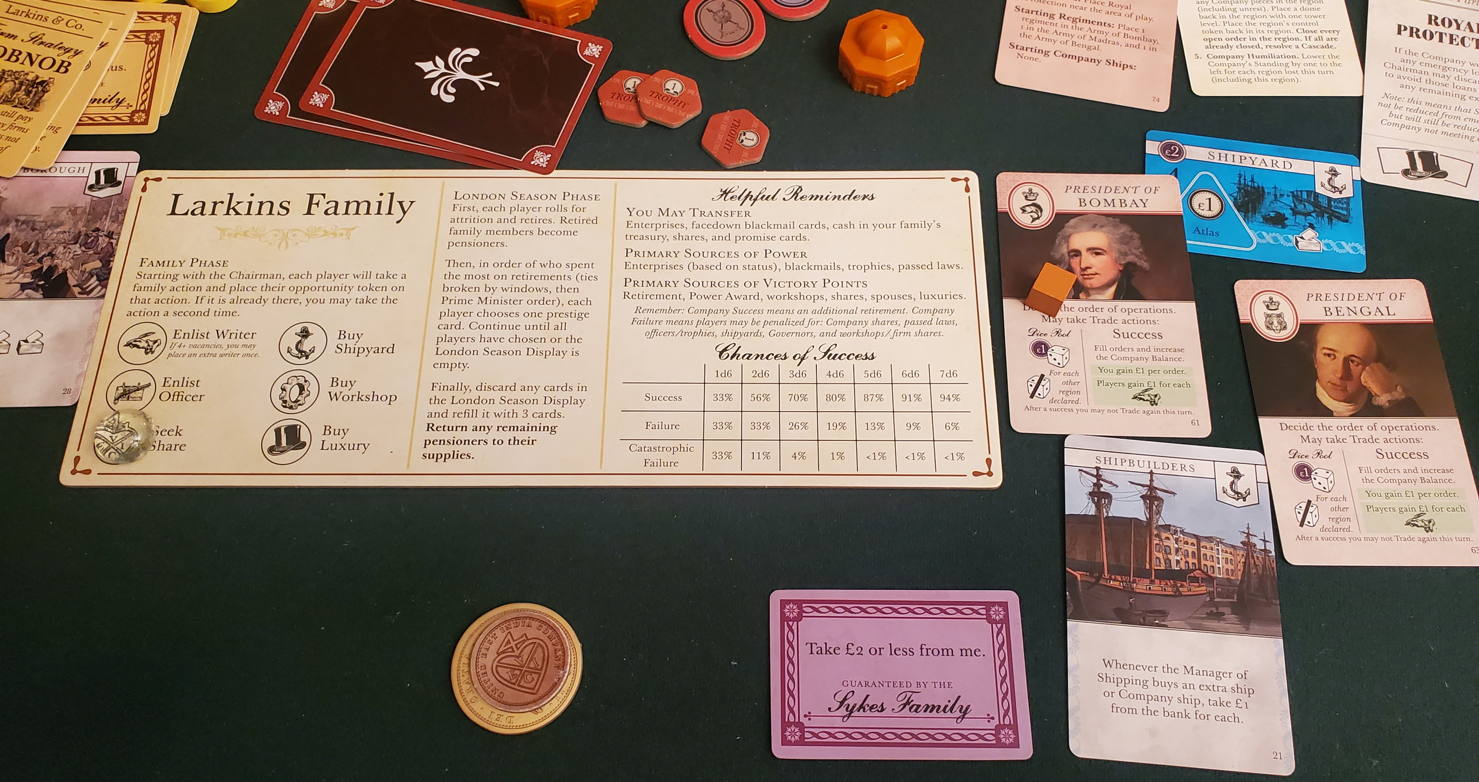 It doesn’t look like one. Typically press-your-luck is a minor mechanism, the sort of thing that operates best in a brisk game. The brisker the better, at least for those who might find themselves on the bruising end of chance. John Company’s shorter scenarios require two to three hours. A full session, which spans from the beginning of the East India Company’s sharpest extraction of wealth from India all the way through the Company’s deregulation and the introduction of private trading firms to the country, might last four or five hours. This past weekend, one of our guests noted that a single round contains seventeen consecutive phases. That’s a bit misleading despite being factually true — if anything, by the end of the game there might be more — but it gives some sense of the game’s scope. John Company is not a morsel lightly digested.