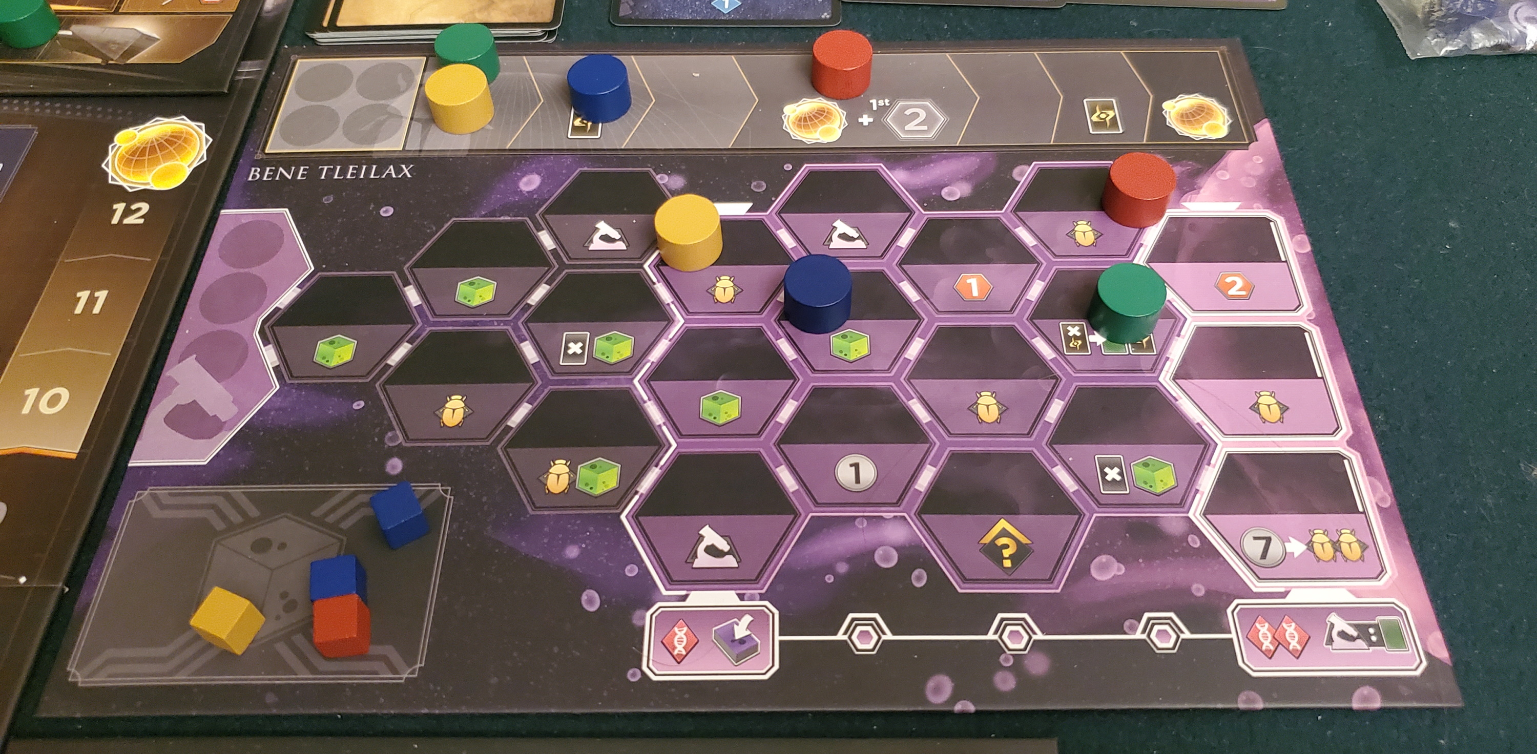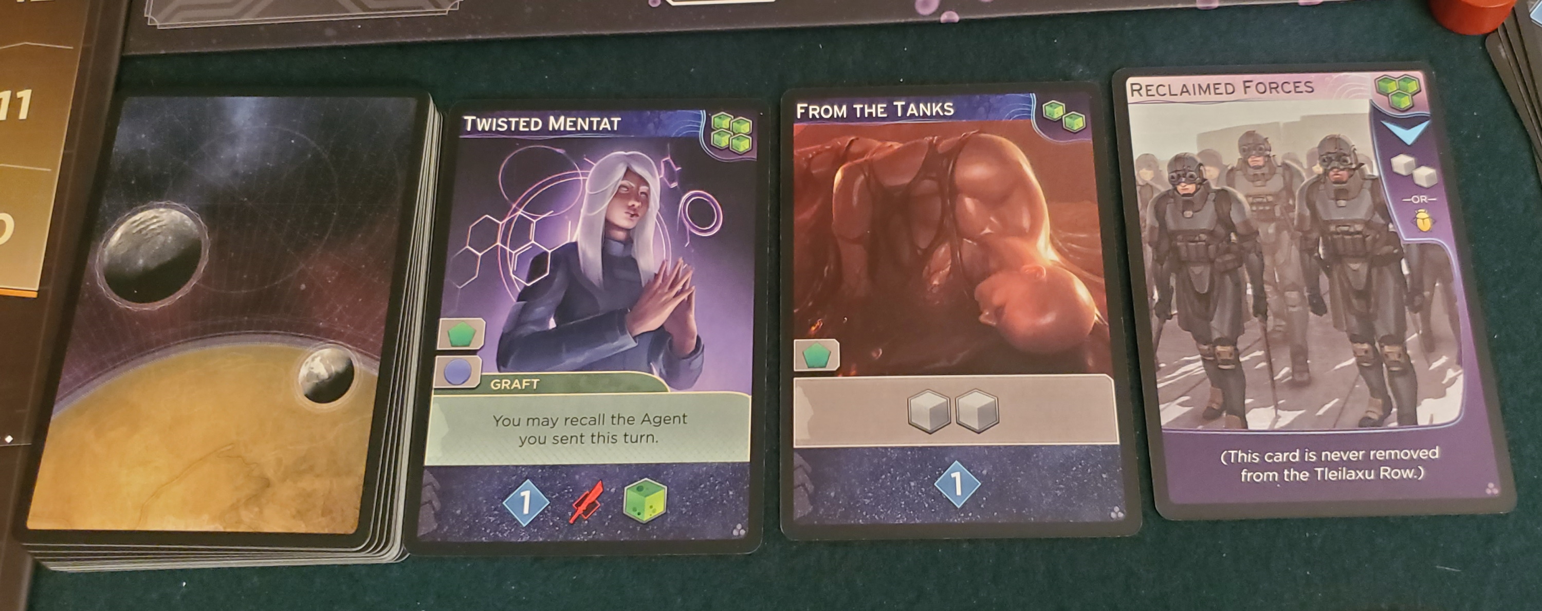 What does it add? Observe, Feyd-Rautha. There are a few bits and bobs, but its major contribution is the Tleilaxu board and an accompanying deck. The board is a track to move along — two tracks, really — that mostly provide benefits for their own sake. Every so often, you toss a corpse onto the board. Yes, a corpse. The game calls them “specimens,” but that’s one of those euphemisms that manages to lay its subject more bare, not less. Anyway, there are plenty of ways to earn them. Certain cards, including a pair of starters that supplant all the pesky “Dune, The Desert Planet” cards from your deck, can generate them as part of your reveal turn. So can a handful of intrigue cards, including those that transform battle casualties into specimens. Hm, wonder what’s going on there? Discarded equipment, surely. At any rate, specimens accrue on the Tleilaxu board much the way Negotiators accrued on the Ix board. Since you don’t have all that many cubes, it’s more important than ever to measure out where you’re deploying them.