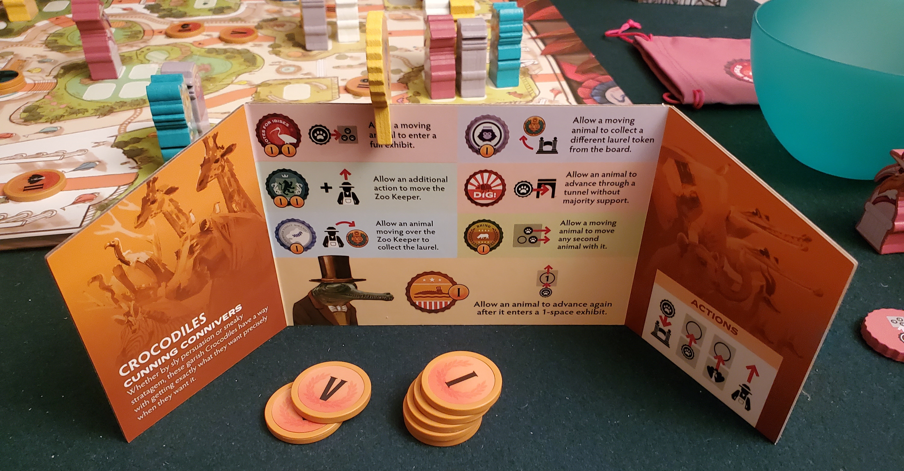 This is where it really starts to shine. Like many of Knizia’s classics, Zoo Vadis doesn’t overload you with a half-dozen currencies, components for building an engine, or competing priorities. Sidereal Confluence, amazing though it is, this is not. Victory is as simple as holding the most points after (and if) you reach the star exhibit. Your bargaining chips, in addition to being literal bargaining chips, are those very same points. You start with two, both 1-value chips, enough to rub together but not much else. As you trample forward, you’ll earn higher-value chips. Their relative value is rarely firm for long.