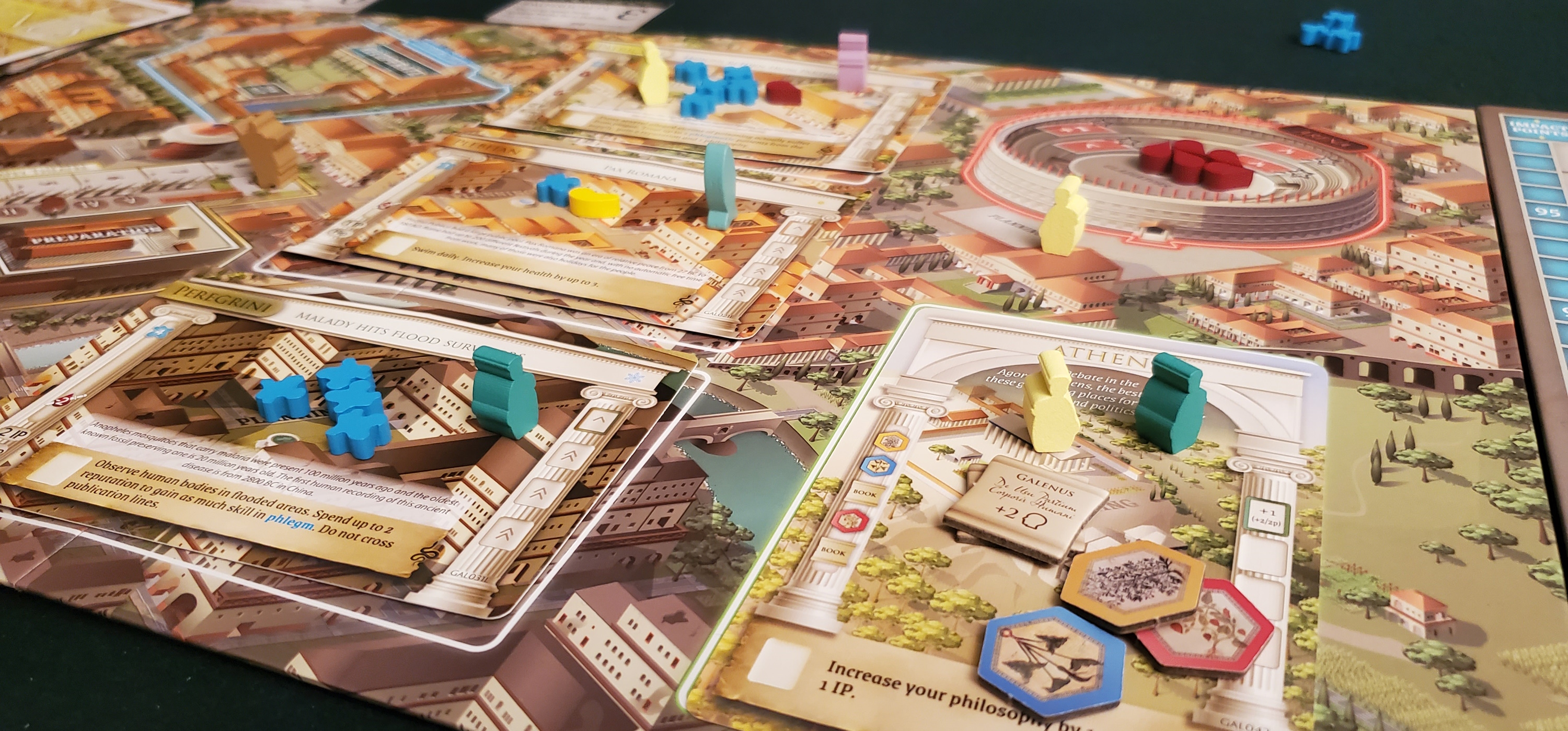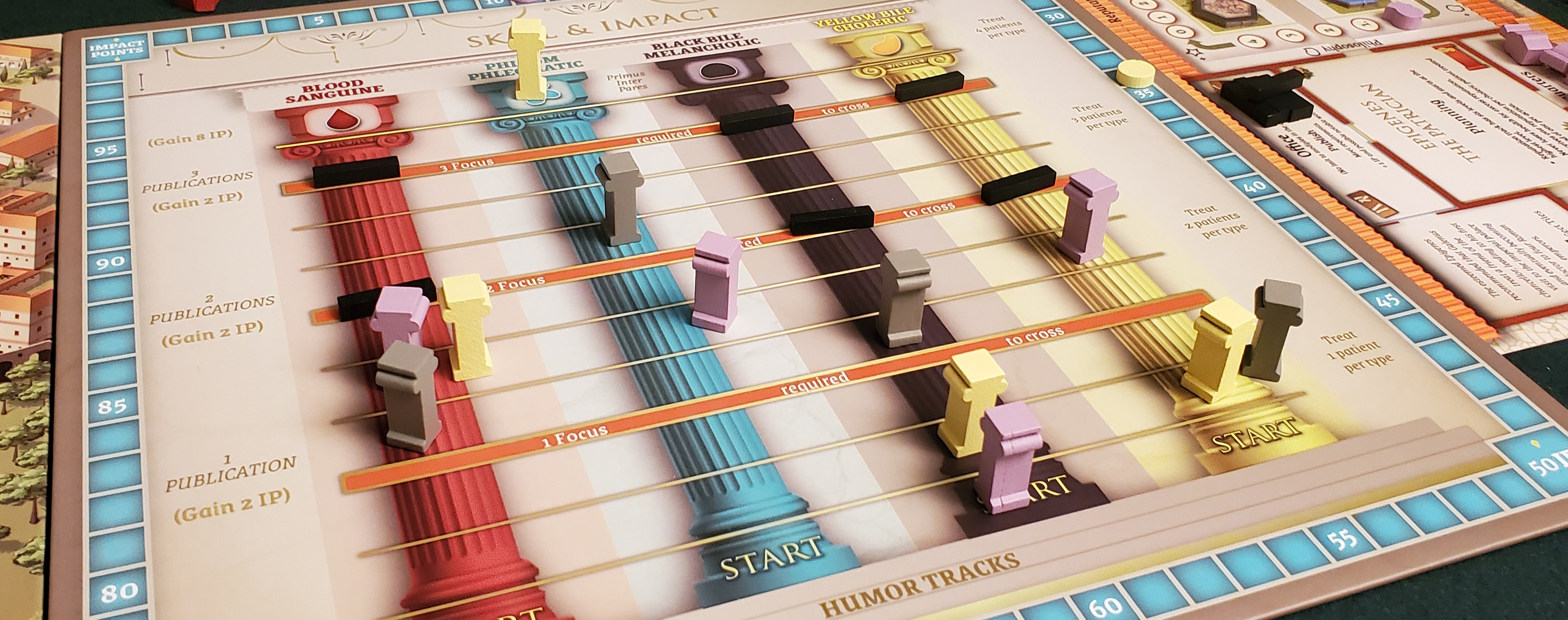 On a technical level, quantities of patients don’t adjust according to player count, leaving higher-count sessions starved for people to treat while those with only two players may find it inordinately difficult to clear certain cards at all. The resulting landscape is oddly flat, not the rapidly changing and often precarious medical world of ancient Rome. This was an opportunity to show why second-century medicine was both vibrant and fraught. The game motions in that direction by offering a constant churn of new cards and worker slots, but even older and more plain-jane worker placement games like Lords of Waterdeep manage more distinction between their moveable components. Here, there’s little reason to note that one card represents “plague in army from Sarmatia” while another claims “tonsors fight for customers.” Apart from the fact that the latter card’s event is literally impossible to fully enact within the game’s rules, anyway.