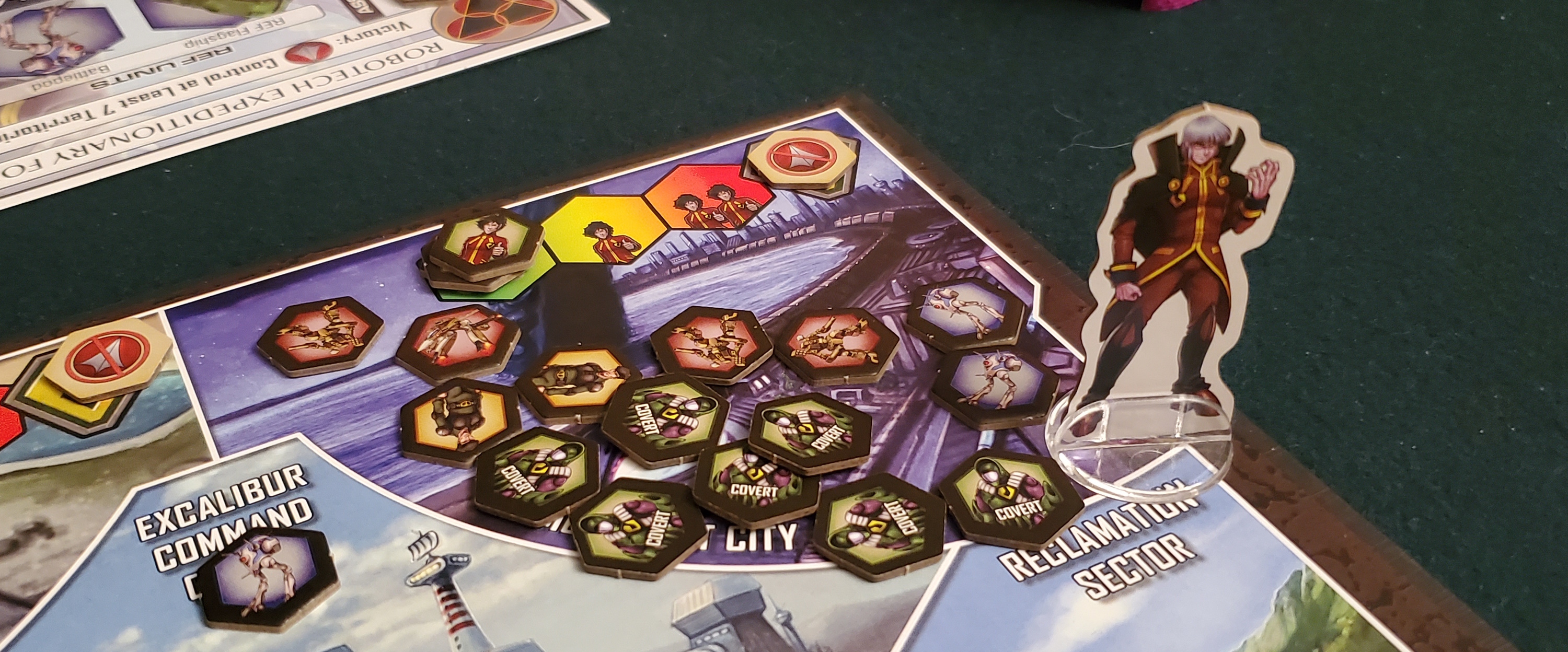 Cards on the table. Robotech: Reconstruction isn’t a perfect game. Like the series it draws inspiration from, it’s complicated enough to get lost in, especially once the action ramps up and you’re tracking tens of units and which side wields control over each region. Expect to make lots of finicky adjustments to the score table. Making matters worse, unlike the COIN Series, its legibility is a nightmare. It uses chits for units, but they’re small and dim, with uniform black borders that really should have been bold colors. The RDF has two classes of mecha that are crucial to tell apart but look almost identical. Anti-Unification League cities are the same size and shape as the rest of the units on the board, and there’s very little distinction between the Zentraedi Rebellion’s covert and overt units — not to mention the descriptors “covert” and “overt” are a minefield for verbal misunderstanding.