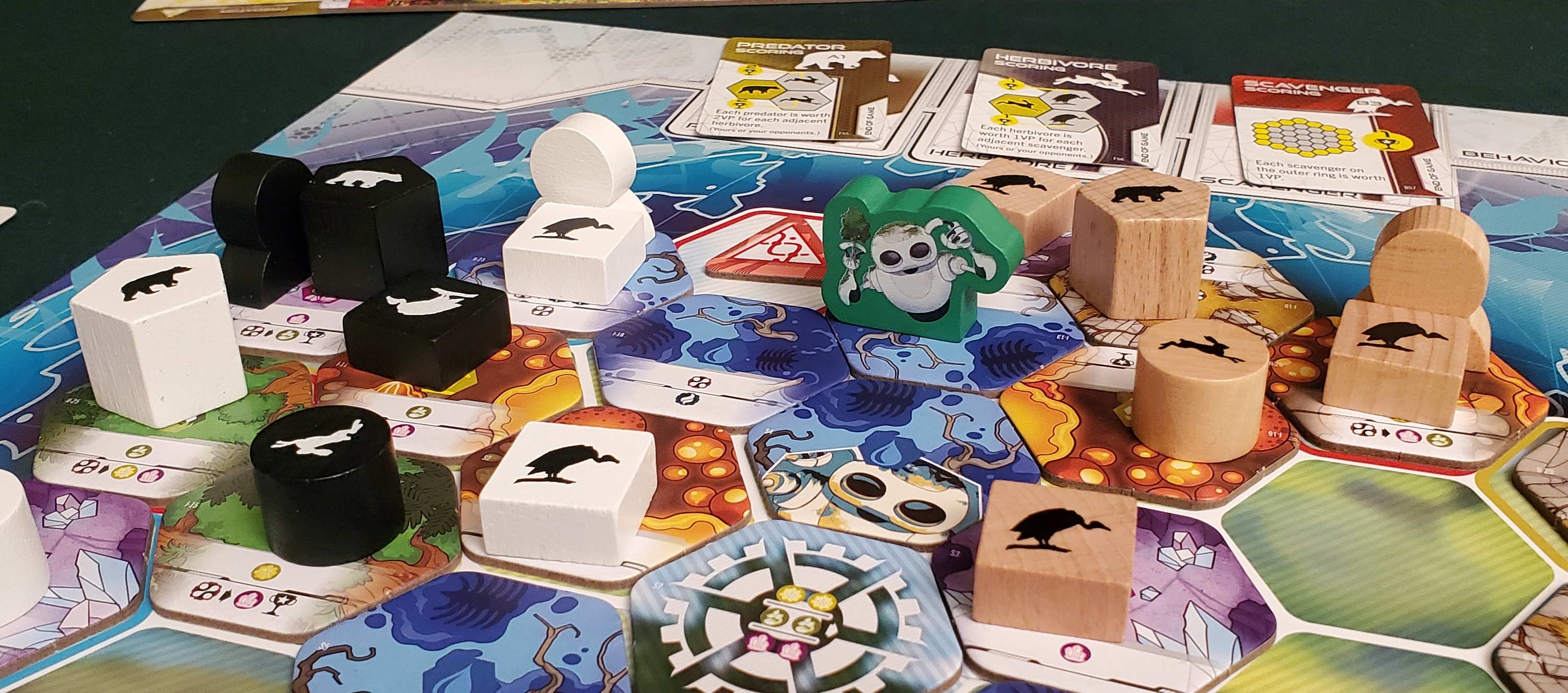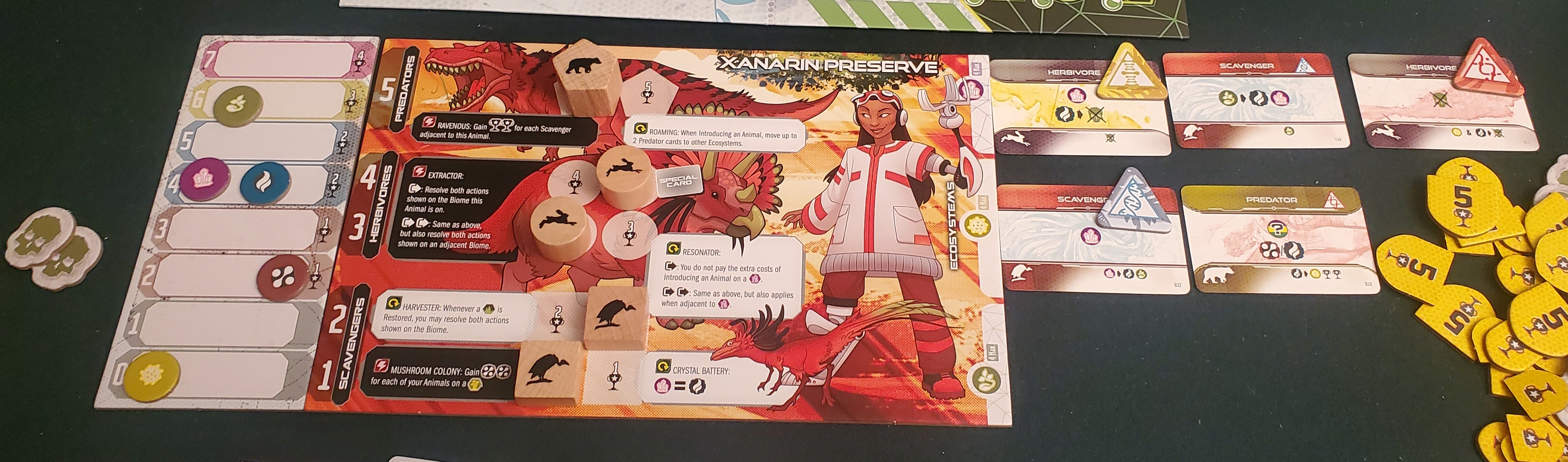Populating is the second action. It’s also the more robust of the two, demanding piles of resources — spores, seeds, crystals — alongside careful placements and bonus selections. That latter consideration is where the game’s meat can be found. Every character offers the same selection of scavengers, herbivores, and predators when it comes to map placement, gradually dotting the landscape with handsome wooden blocks. Everyone is chasing identical placement bonuses. Say, that scavengers are worth points on the periphery of the biosphere, while predators like hanging out near herbivores. Meanwhile, every populated creature also adds a card to the corresponding ecosystem next to your player mat, gradually building chaining bonuses. Put together, it’s a lot to take in.