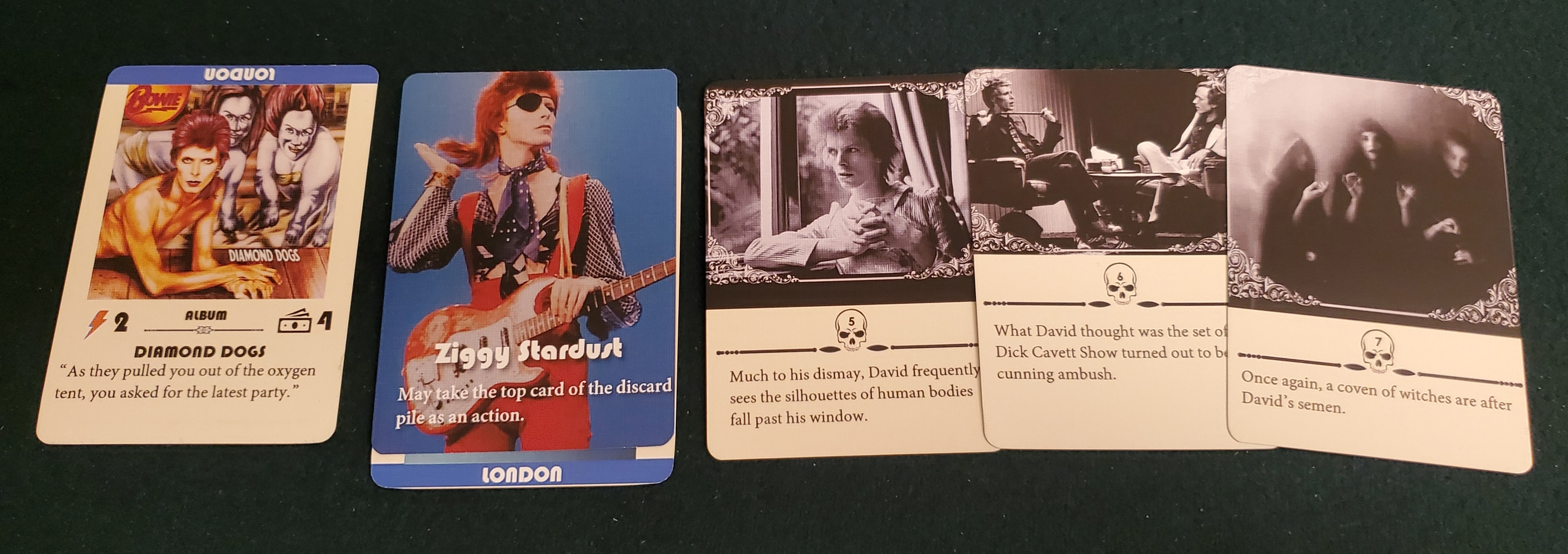 Over the course of play, drawing certain cards from the deck will present David Bowie with a threat. There’s some jankiness to consider — really, the entire thing is janky, although that’s a not-insignificant source of its charm. Drawing a threat only matters when drawn as an action, not when drawn at the start of the game or as the result of some other effect, a rule I guarantee somebody will flub. But when a threat rears its head, the game pauses. Maybe David Bowie is convinced the Manson Family are after him. Maybe an interview with Dick Cavett isn’t going as planned. Or maybe a coven of witches are trying to get ahold of his semen. Whatever the crisis, everybody must pool their resources to resolve it. The bulk of the responsibility falls to a single persona, but suddenly everybody’s hand is thrown into doubt. Those inspirations, your albums, they’re all potential sacrifices on the altar of addiction.