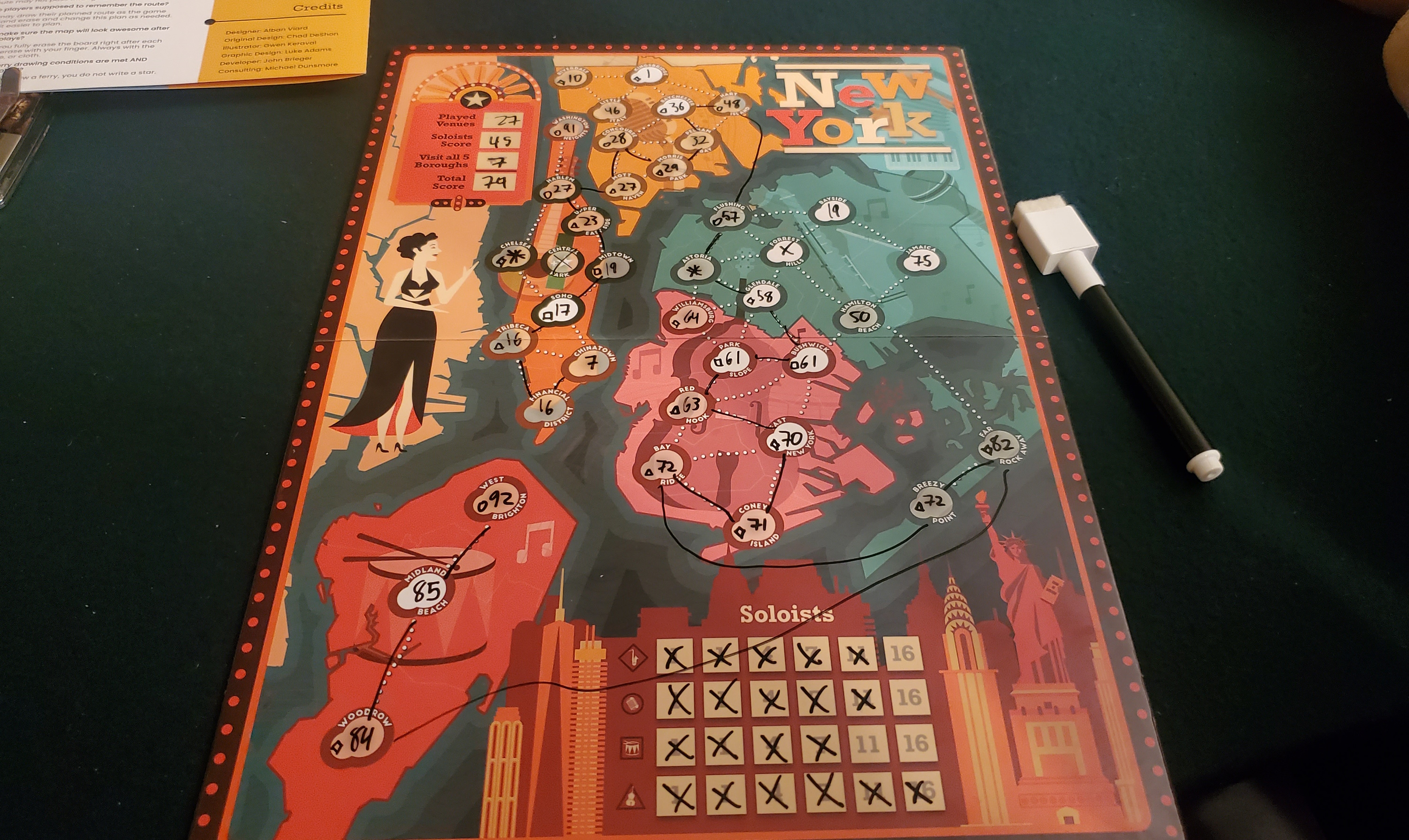 The route-building itself becomes perhaps too easy, traced in sweeping ellipses and intra-borough zigzags that often visit every borough. Viard has an answer to that. While it still pays to prioritize the length of your route, you also want to stop by particular destinations to perform with soloists. There are four categories, ostensibly saxophones and singers and whatnot, but more recognizable as diamonds, circles, squares, and triangles. These are marked whenever you pen a number into a card’s precise stop. This demands more precision than the dual-purpose arrondissements of Paris. It also generates greater tension than the wild stars of previous maps, getting players to chase particular symbols in order to rack up the best points. It’s an additional layer that feels both natural and much-needed, offering competing priorities instead of funneling everybody toward the same victory condition.