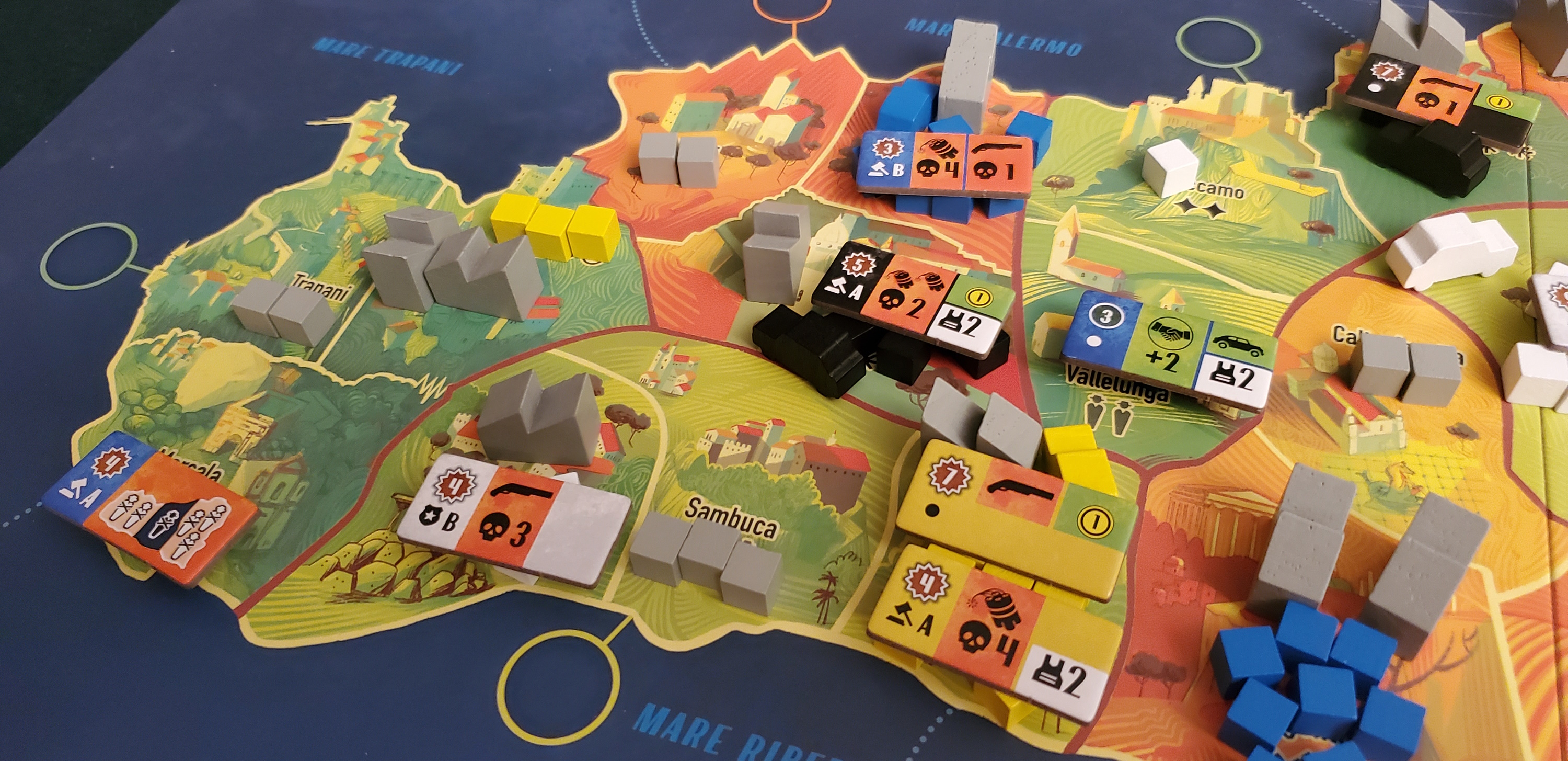 The real star of this brawl is the map itself. Sicily is divided into twelve mandamenti, each with three sub-areas. The goal of the game is to control a certain number by round’s end. Control itself is a ragged and tenuous thing, defined as having troops in two of a mandamento’s three areas. This leads to a brittle state of affairs as families seize the bare minimum necessary to control an area, leaving their opposition untouched elsewhere. It isn’t long before the map is marbled with opposing factions, entire regions one or two solid orders away from swapping hands. It’s an attacker’s game; staying put is liable to get your soldiers blown up or circumvented altogether. Once everyone figures that out, it becomes very difficult indeed to determine your course of action.