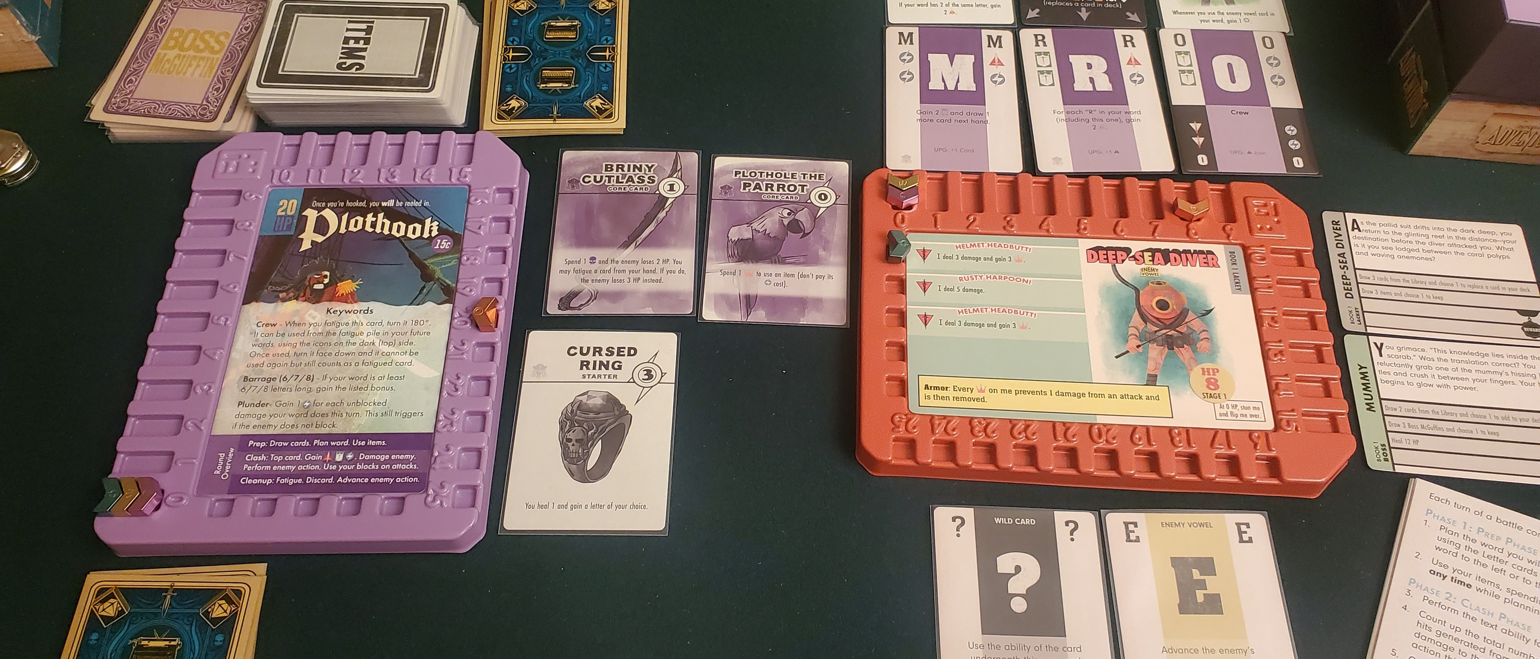 My personal favorite is Plothook. One of the game’s best ideas comes from none other than Gloomhaven. When you finish a word, your top card triggers its special ability but is then fatigued and removed for the remainder of the fight. This depletes your hero’s deck turn by turn, forcing you to craft words despite a diminishing pool of letters. Plothook inverts this limitation thanks to crew cards. These punks flip over when used, becoming temporarily more powerful. They still fatigue once you use them again, even if they weren’t your top letter, but they let you get in an extra punch before falling off the table. This helps trigger Plothook’s second personal ability, barrage, which offers greater bonuses for longer words. And you know I love my long words. I recently used “tergiversation” in a conversation. In part to avoid making a clear-cut statement, which made the use of that word doubly delicious. Long live Plothook.
