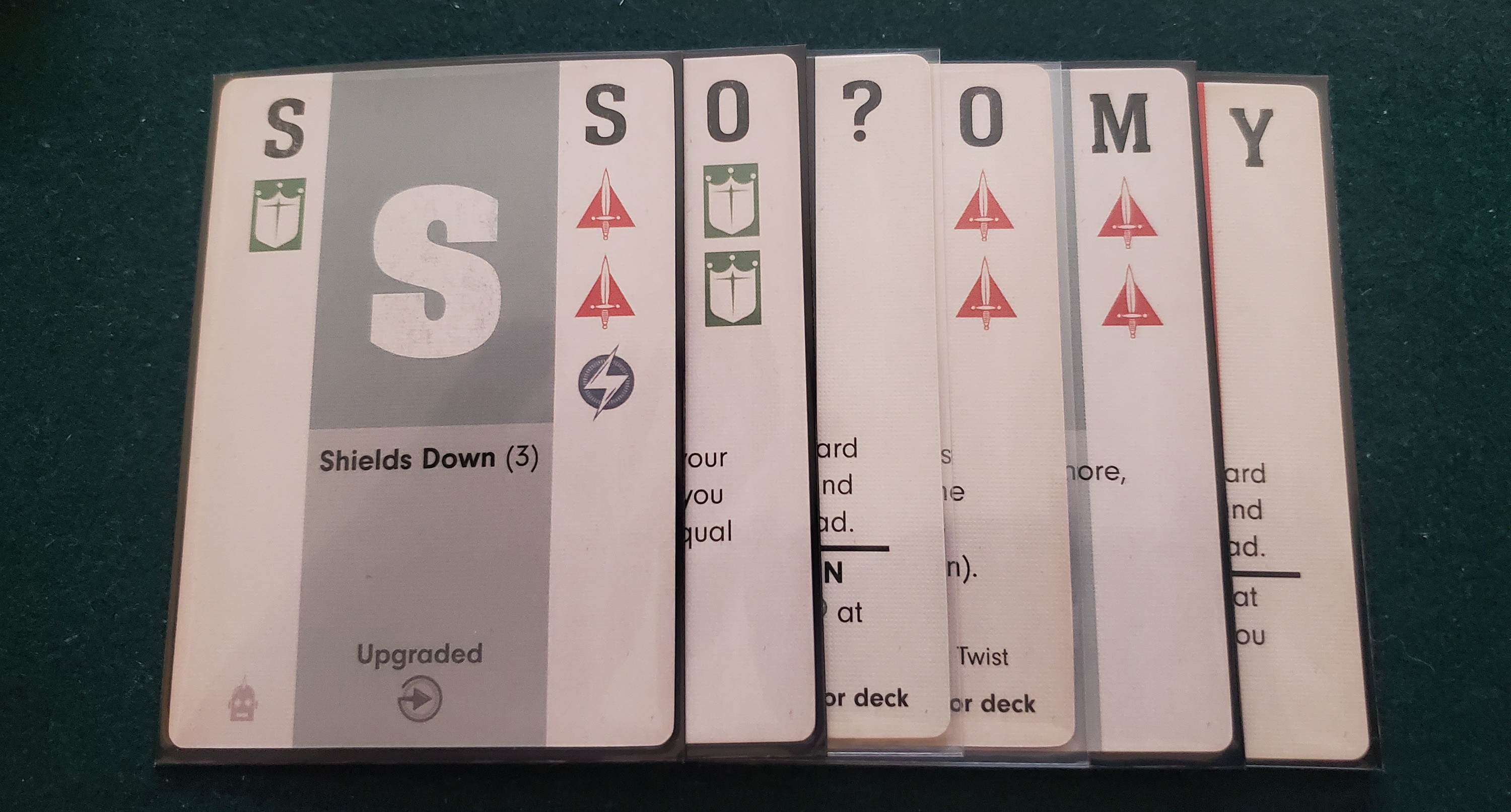 In general, you draw four letters. You also have a wildcard. In most cases your foe will grant you an additional vowel. From these six cards, you create a word. But wait! That’s only the first part of the conundrum. It isn’t enough to cobble together any old locution. Every letter also comes with untapped potential. There are magical icons on its sides, little swords, shields, and lightning bolts. As you spell a word, these must be splayed right or left, accessing certain icons at the expense of others. Even more importantly, this arrangement determines which letter comes out on top. This is the sole letter that also deploys its special ability.