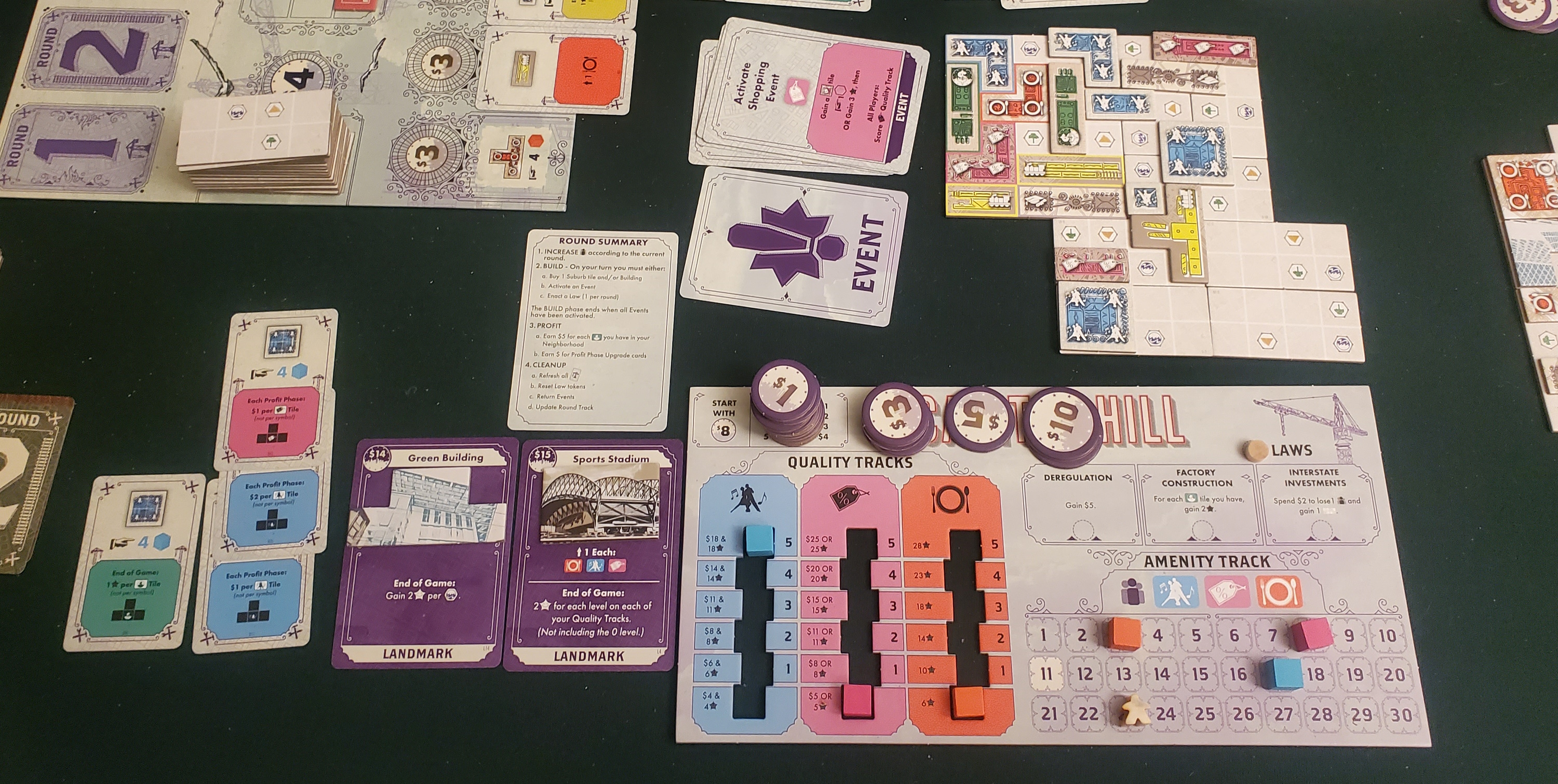 It’s hard to overstate how clever these events are. The entirety of Rebuilding Seattle is like running a race; your goal is to nab the best buildings before anybody else. It’s helpful, then, that events act to pad your bank account in the middle of the round. Rather than setting everybody on the same track — one of steadily diminishing velocity as your wallet runs dry — this generates little spikes of activity. You spend what you can, trigger an event, keep spending, and hope that nobody claims the final event, and thus ends the round, before you meet your personal goals.